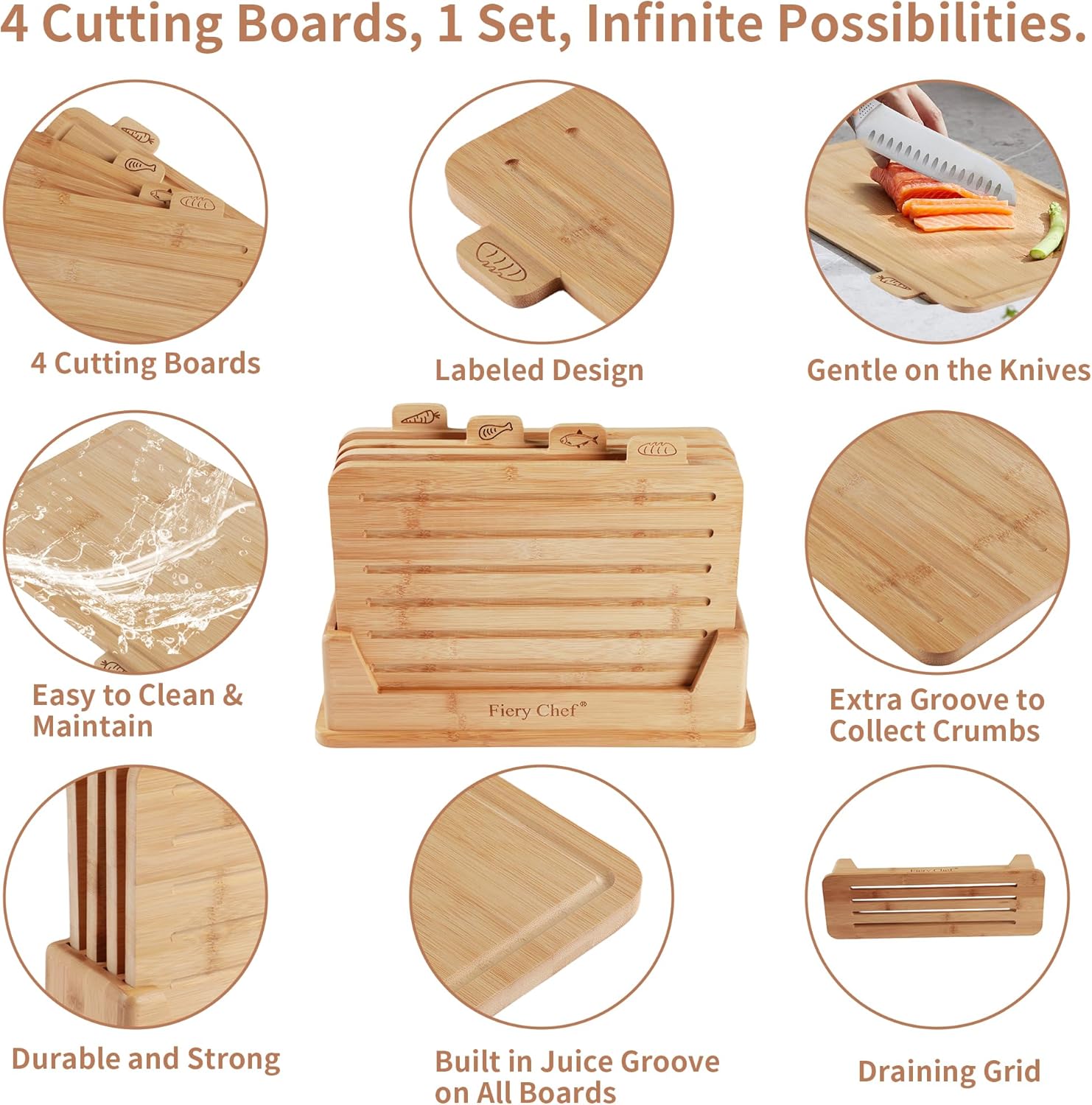 ORGANIZED COOKING WITH FOOD ICONS: Our Bamboo Wood Chopping board Set includes four boards labeled with food icons – no more mixing up your veggies and meat. Enjoy a well-organized, efficient kitchen!