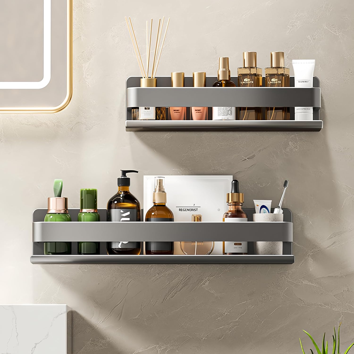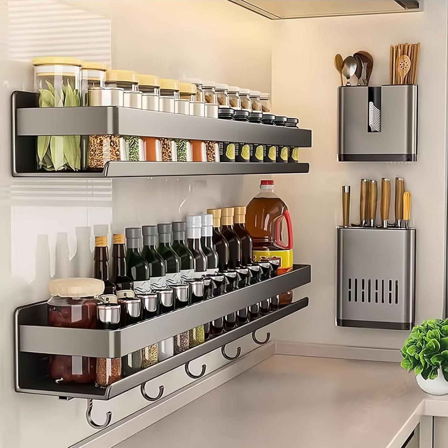Premium Carbon Steel Construction for Long-Lasting Use Crafted from high-quality carbon steel with a sleek dark gray finish, this wall-mounted spice rack is built to resist rust, scratches, and daily wear and tear. Its sturdy frame easily holds your spice jars, seasoning bottles, shower gels, shampoos, or bathroom essentials without bending or warping—perfect for busy kitchens and humid bathrooms.
