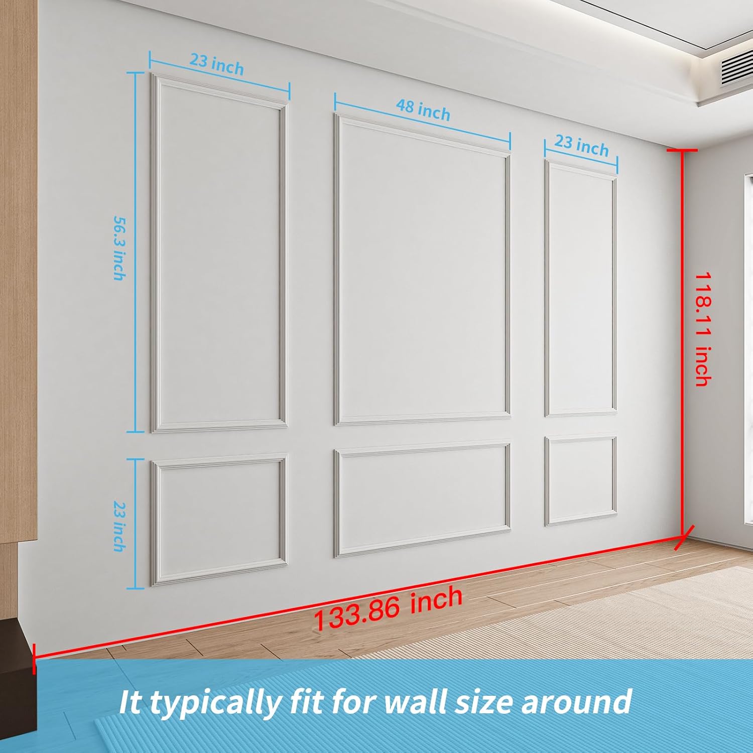 Coverage – Package comes with 24 wall molding kits, including 3 Top 3 Bottom pieces, for a wall measure around 10ft high by 11ft wide