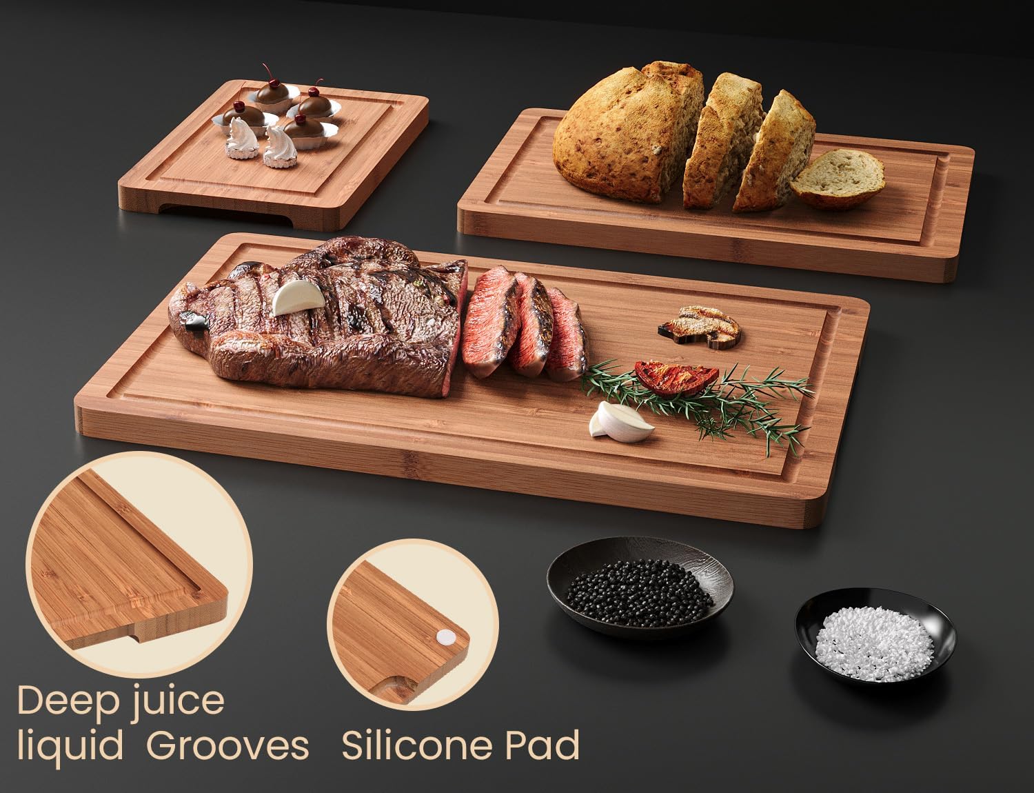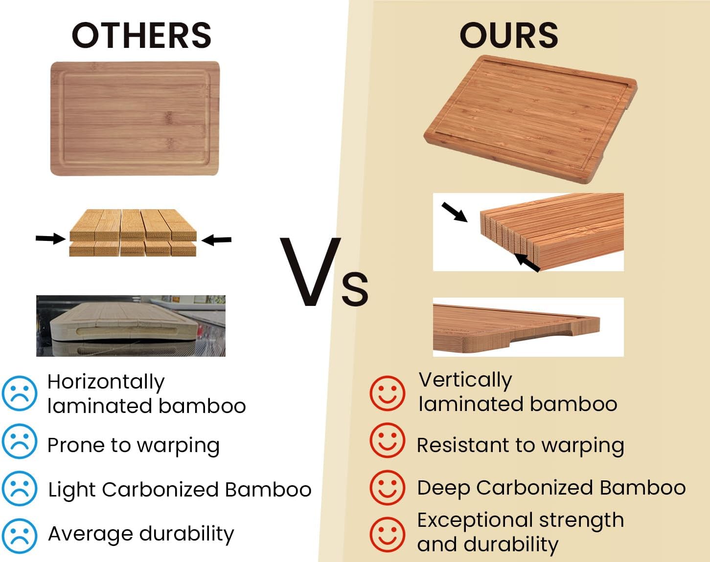 【Vertically Laminated bamboo,Stability and Durability】Our bamboo cutting board is crafted from vertically laminated bamboo, which is significantly more durable and resistant to warping compared to boards made with horizontal lamination, ensuring a stronger and longer-lasting kitchen tool.