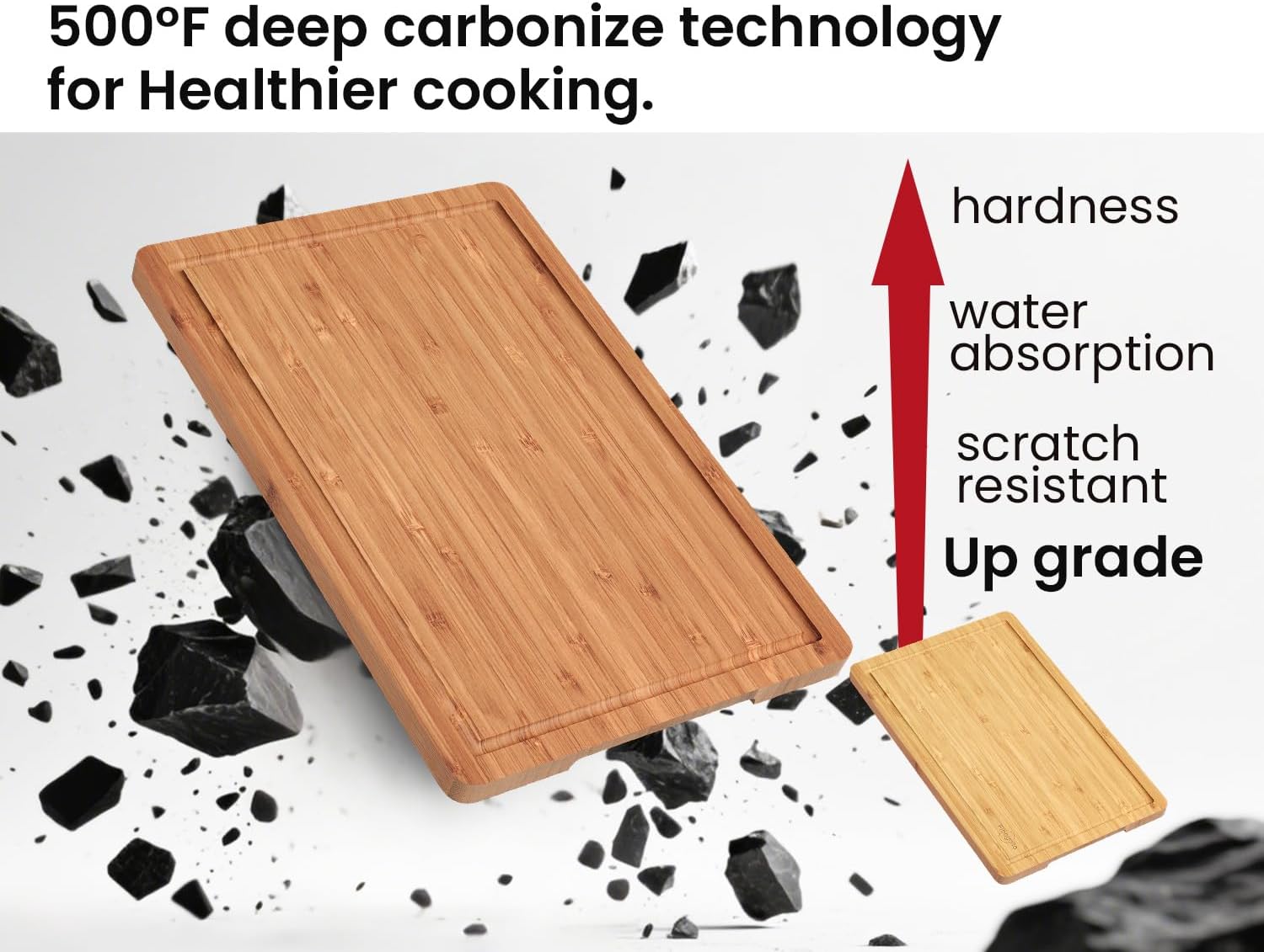 【Thermal Carbonization Process, Elevating Quality 】 This cutting board undergoes a high-temperature thermal carbonization process at 500°F. Compared to ordinary boards, this process removes moisture and impurities, making it less prone to warping and cracking. Consequently, it better withstands the various pressures encountered during daily use.The thermal carbonization enhances the board’s performance while creating a unique rich, dark hue that seamlessly complements kitchens of any décor style.