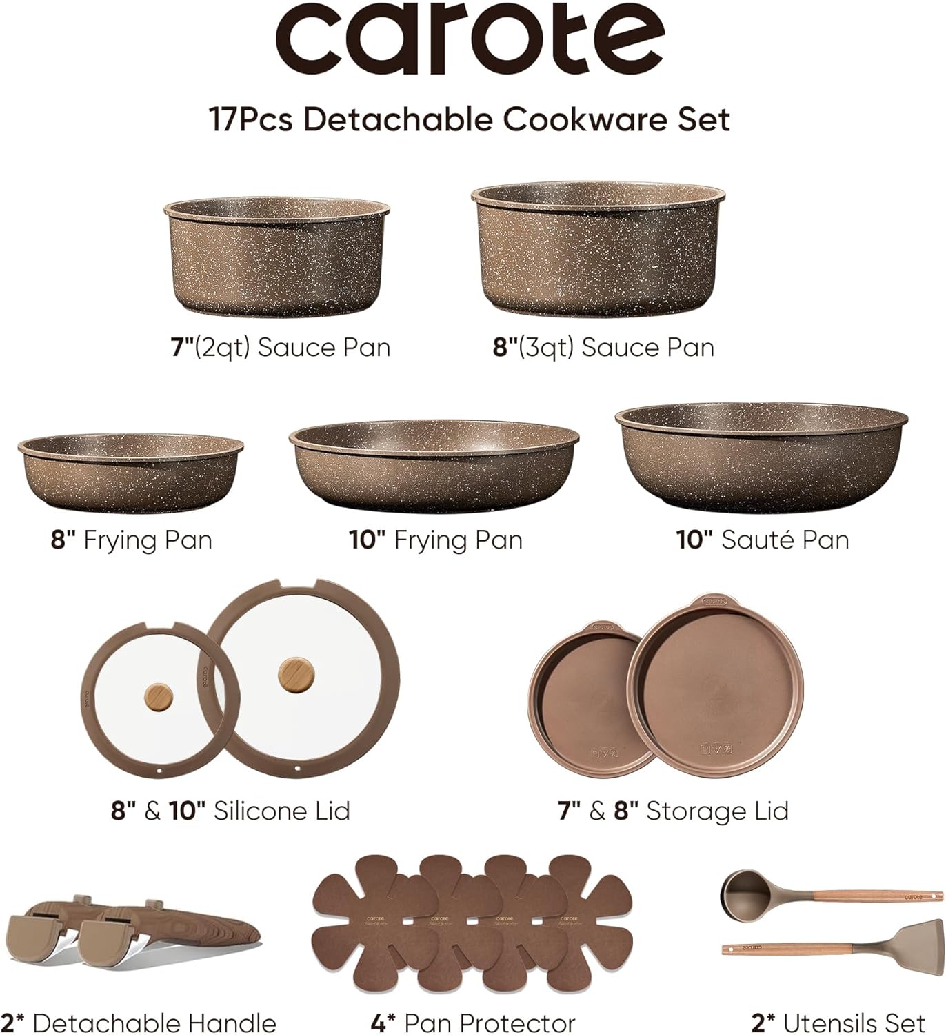 CAROTE 17PCS Pots and Pans Set Non Stick with Detachable Handle, Nonstick Cookware Sets, Cooking Kitchen Set, Oven/Dishwasher Safe, Induction Cookware, Brown, RV Kitchen Pot and Pan
