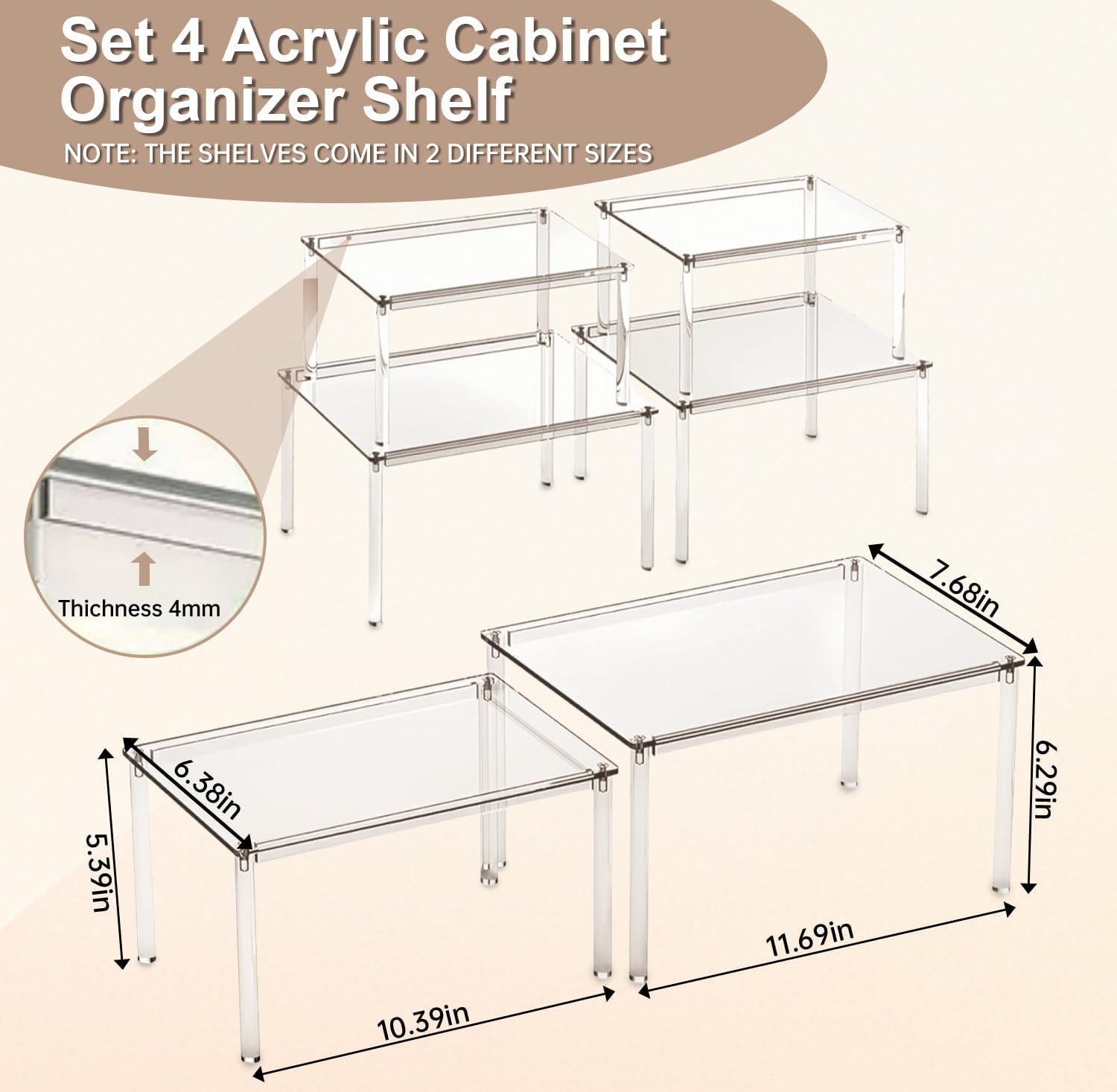 【WHAT WILL YOU GET】4 kitchen cabinet organizer (2 Large Shelf Organizers 11.7 W*7.7 D*6.3H inch and 2 Small Shelf Organizers 10.4 W*6.4 D*5.4H inch, 16 Screws, 8 Long Support Legs, 8 Short Support Legs, 16 Anti-slip adhesive).The spice rack organizer for cabinet combo mode are available according to your needs—the power to organize smarter is in your hands.