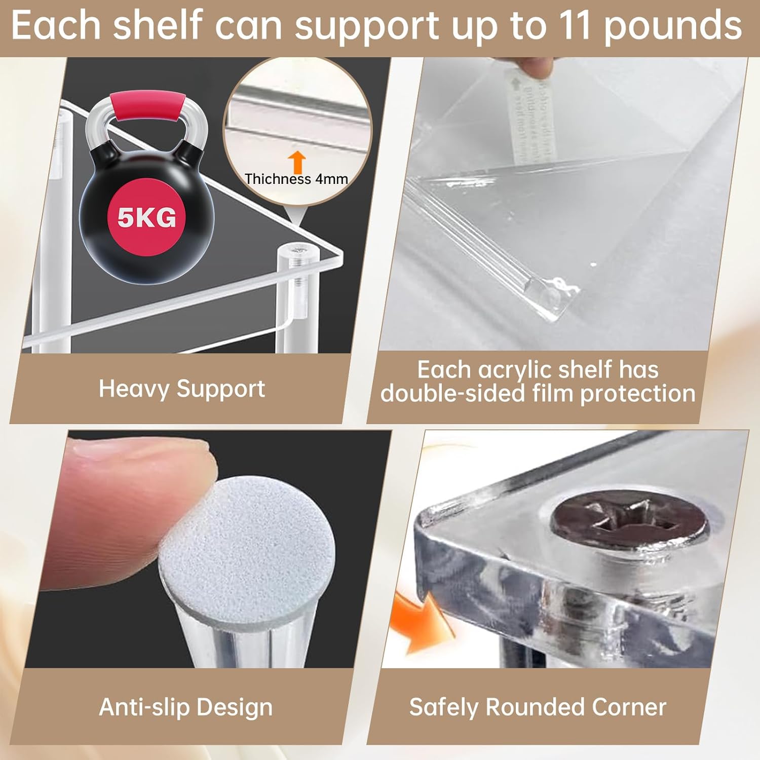 【STRONG & EASY TO CLEAN】Our spice organization for cabinet, which made from high quality acrylic, a new, attractive and strong material. The thickness of 4mm sturdy support can well hold glass bottles and bowls safely. Cleaning is a breeze, just a quick wipe with soapy water keeps our pantry organizaton looking brand new. The non-slip pads underneath keep everything secure and scratch-free.