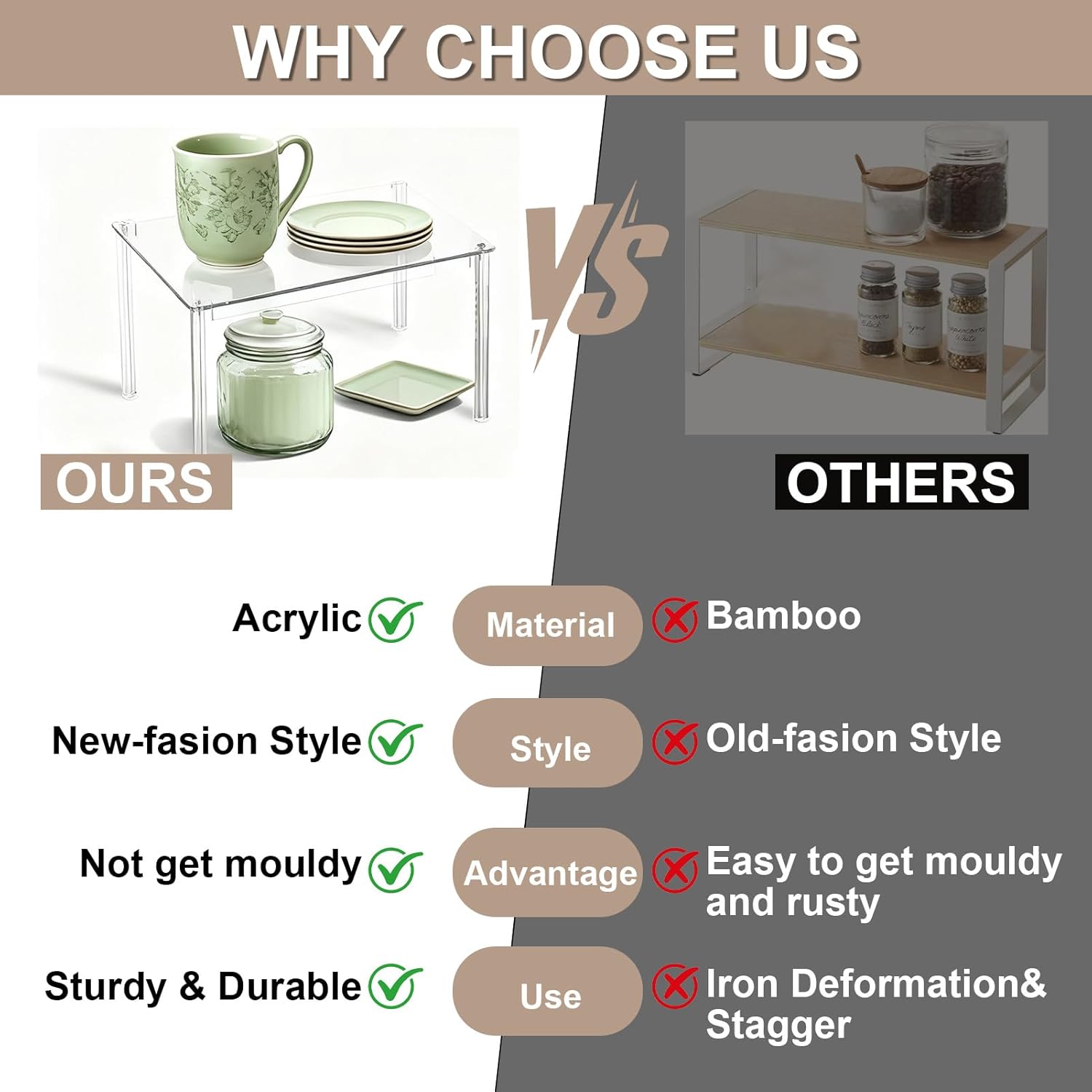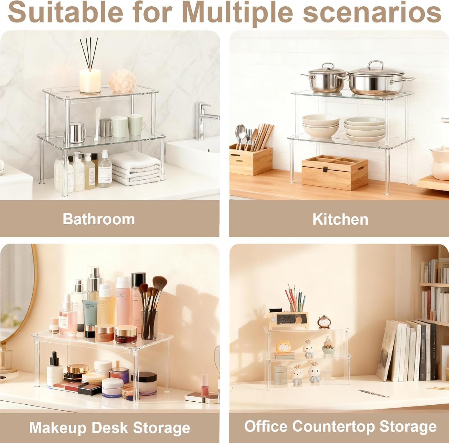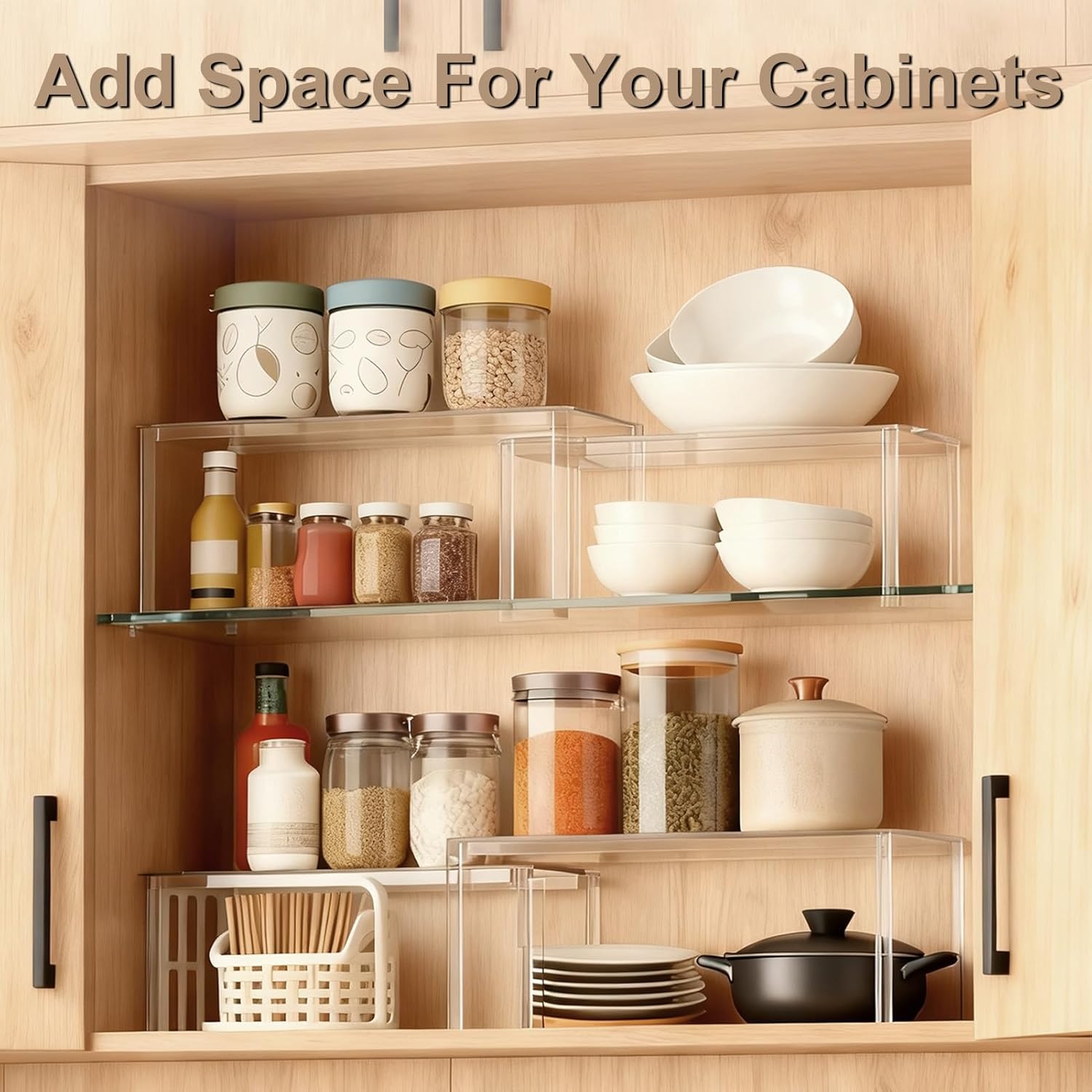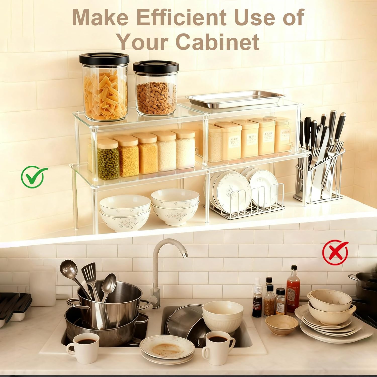 【SOLVING CABINET STORAGE WOES—NOT JUST FOR KITCHEN】Our cabinet organizer are not only spice organization for cabinet, but also for pantry organizers and storage.Our clear acrylic shelves can also serve as excellent countertop organizers for bedroom, desk, bathroom, coffee bar inside cabinets, under sink storage, solving cabinet storage woes—keep essentials visible and neatly displayed.