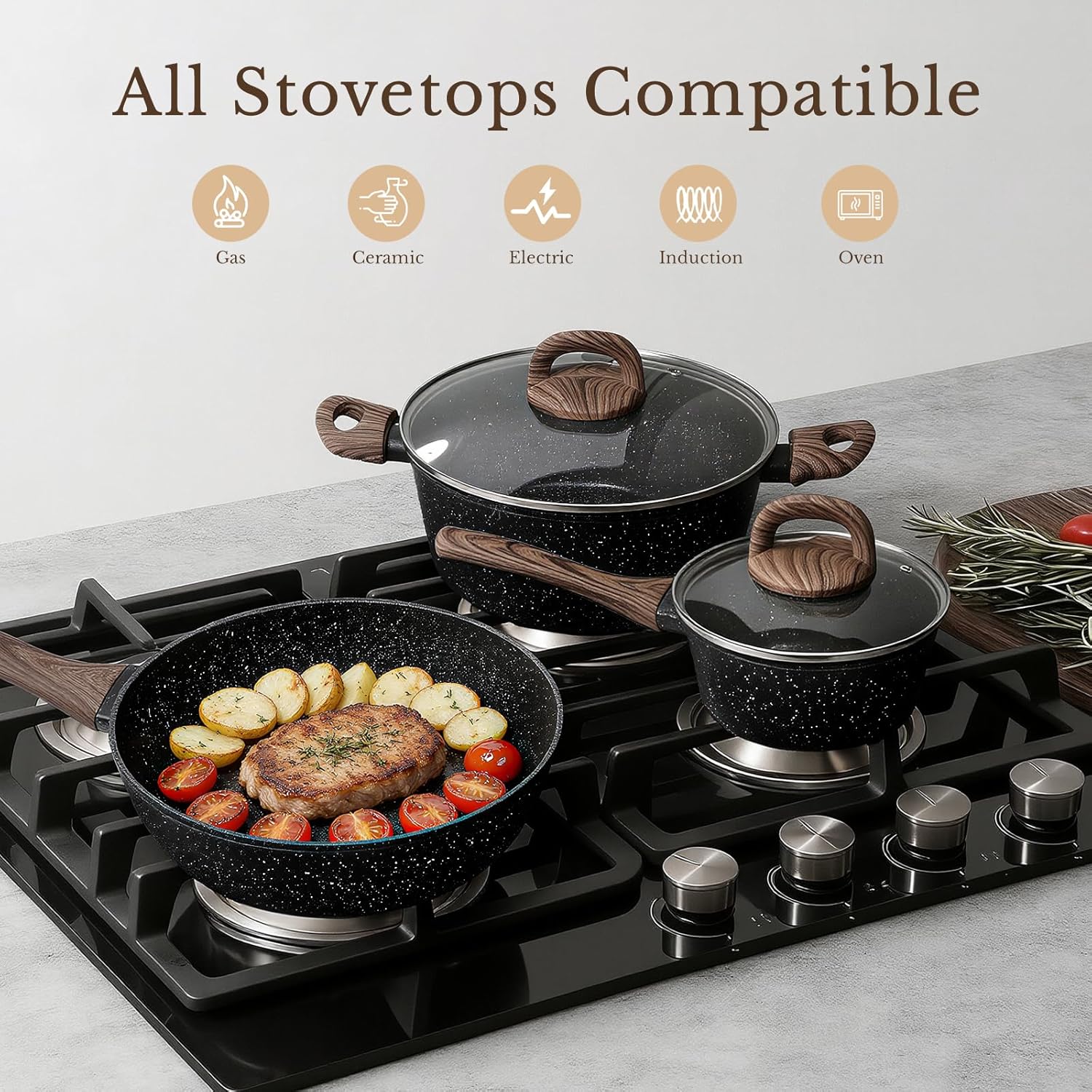 INDUCTION COMPATIBLE: Thick stainless steel bottom makes this pots and pans set suitable for all stovetops and ensures durability. Die-cast aluminum construction allows the pan to heat up quickly and evenly, keeping the heat consistent. No warping and durable.