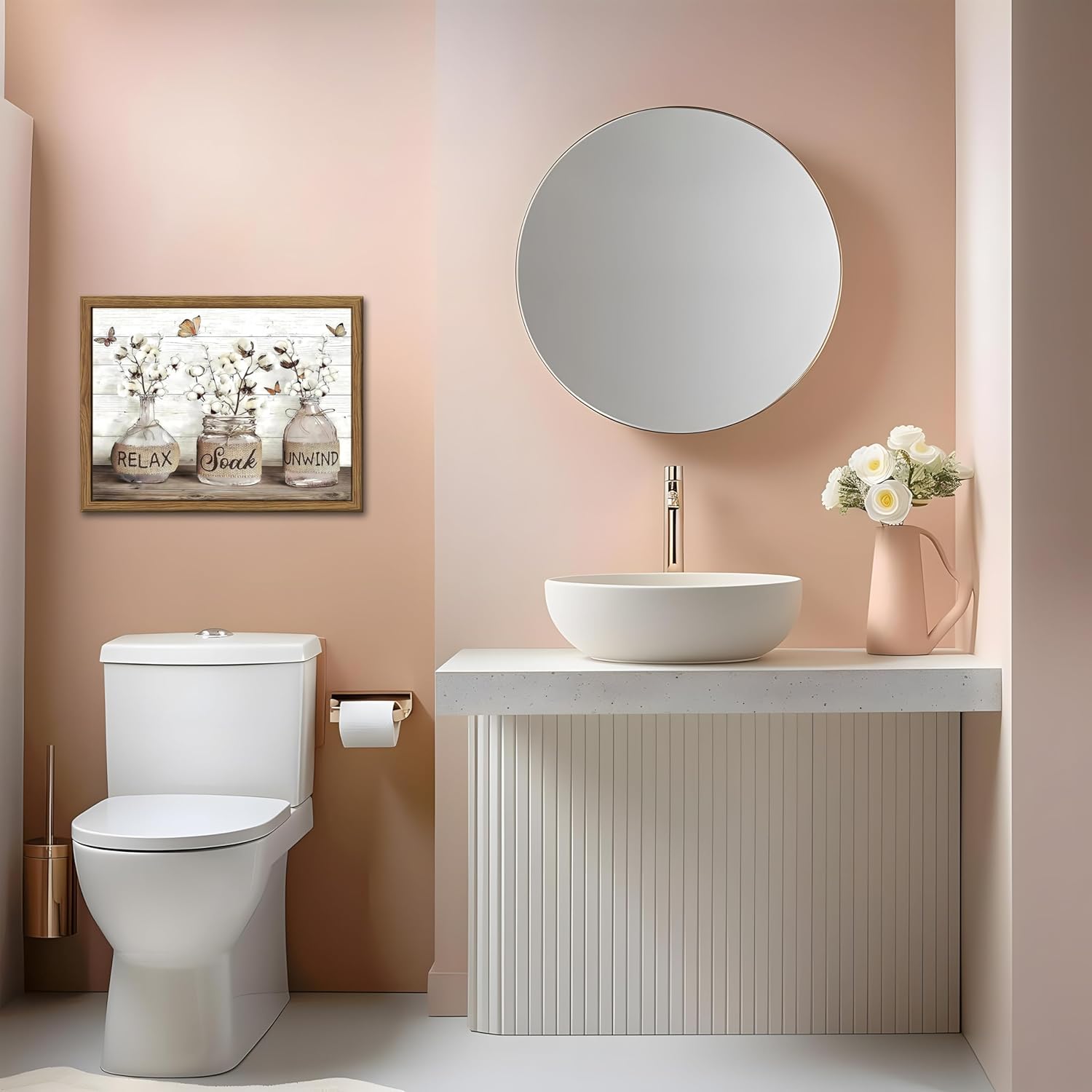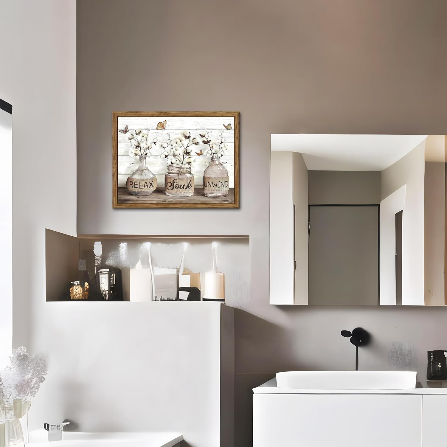 【Charming Farmhouse Bathroom Decor】Add a touch of rustic charm to your bathroom with this framed farmhouse bathroom decor. The bathroom wall art features a serene cotton picture with calming text, perfect for creating a cozy and welcoming atmosphere. This piece is ideal for those looking to incorporate bathroom pictures wall decor that reflects a modern country bathroom decor style.