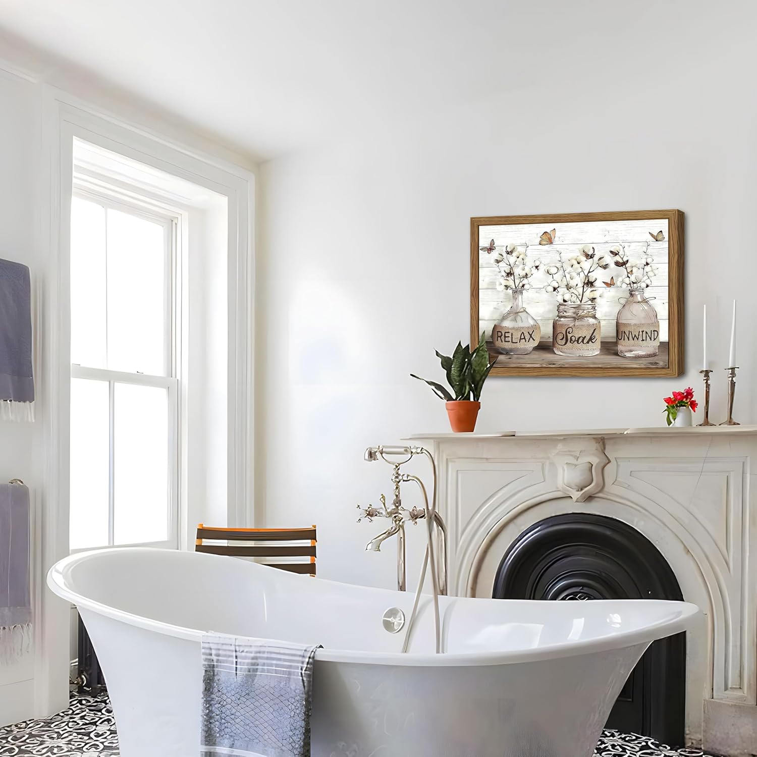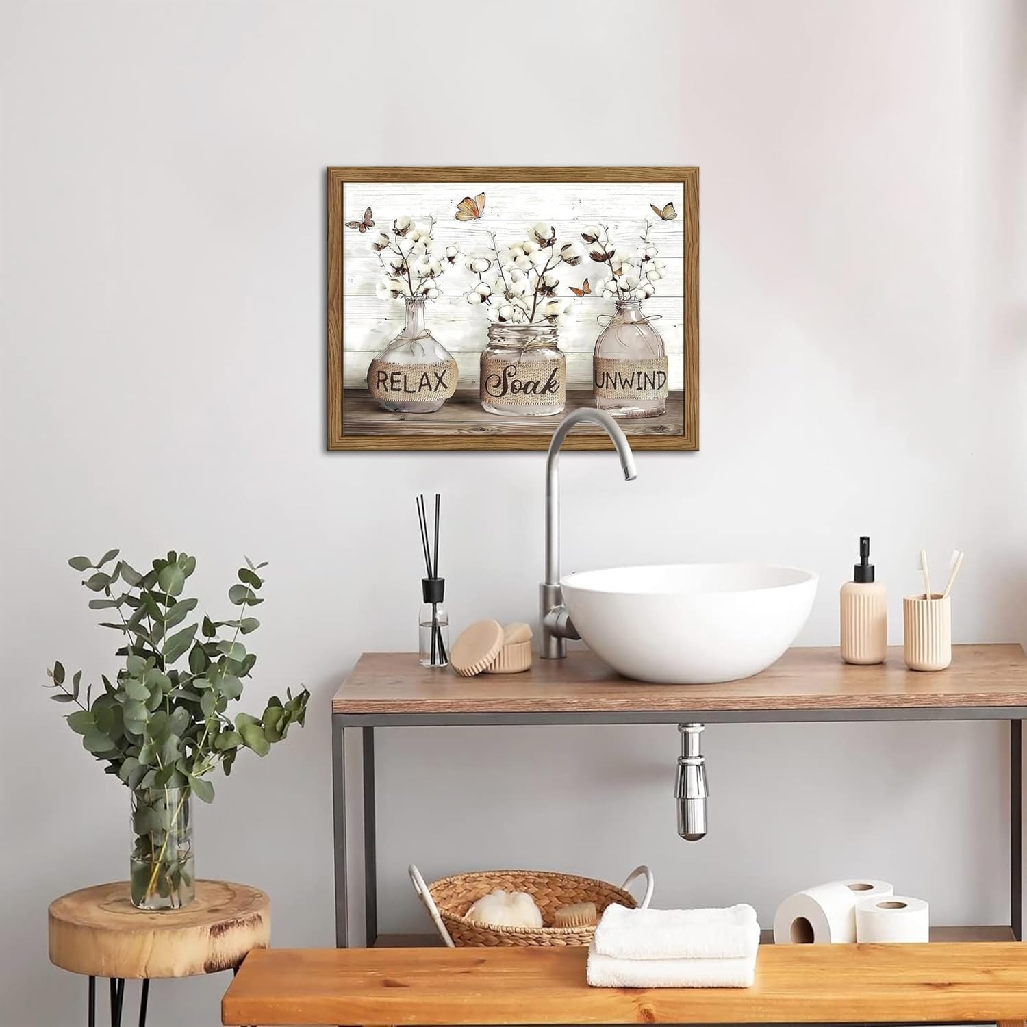 【Inspiring Design with Relaxing Vibes】This relax soak unwind wall art bathroom brings peaceful vibes to your bathroom, making it a perfect piece of bathroom artwork for wall. The calming words paired with rustic imagery help transform your space into a relaxing retreat, ideal for those who appreciate modern farmhouse bathroom wall decor.