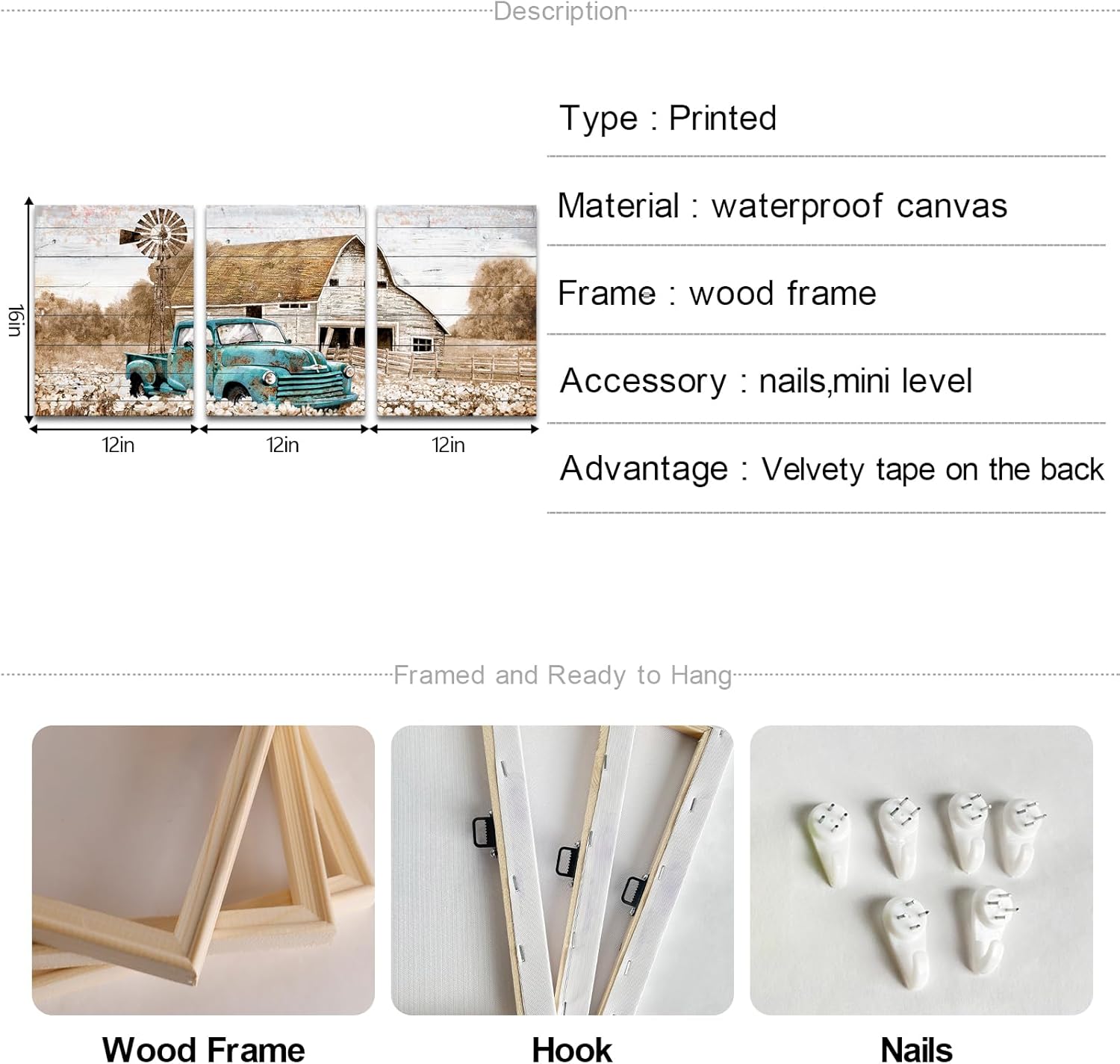 Country wall art size :12″x16″x3 Pieces