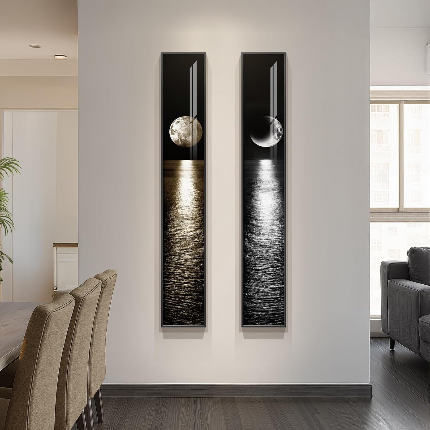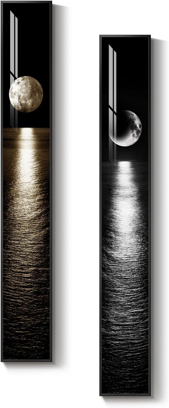 [Moon Wall Art]: This 2-piece wall art set features a stunning moonlit ocean scene in black, white, and gold tones. The long narrow vertical format creates a sleek, contemporary style, while the shimmering moon reflection adds depth and elegance. Perfect for decorating your living room, bedroom, entryway, hallway, dining room, or office, these prints bring a serene yet luxurious atmosphere to any space