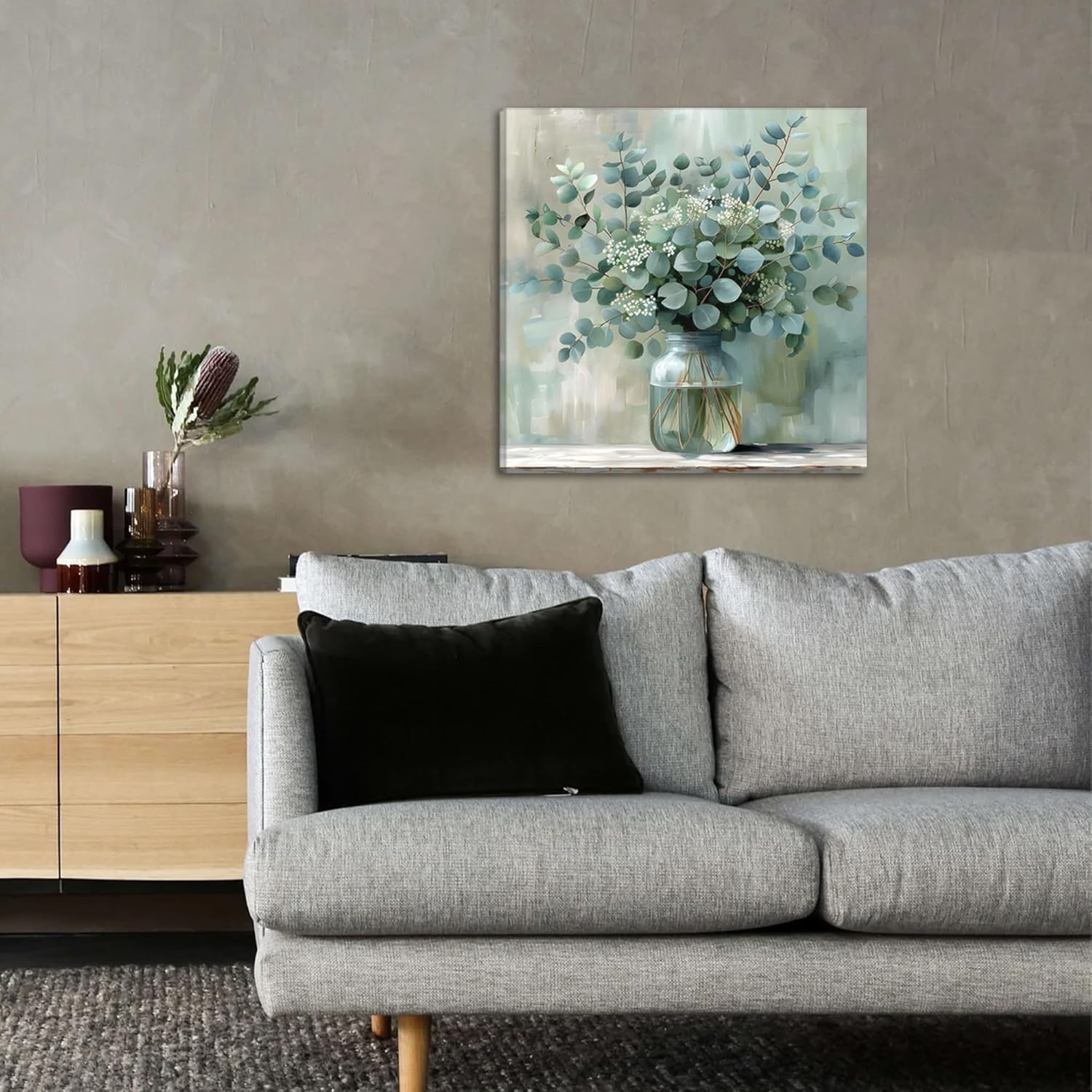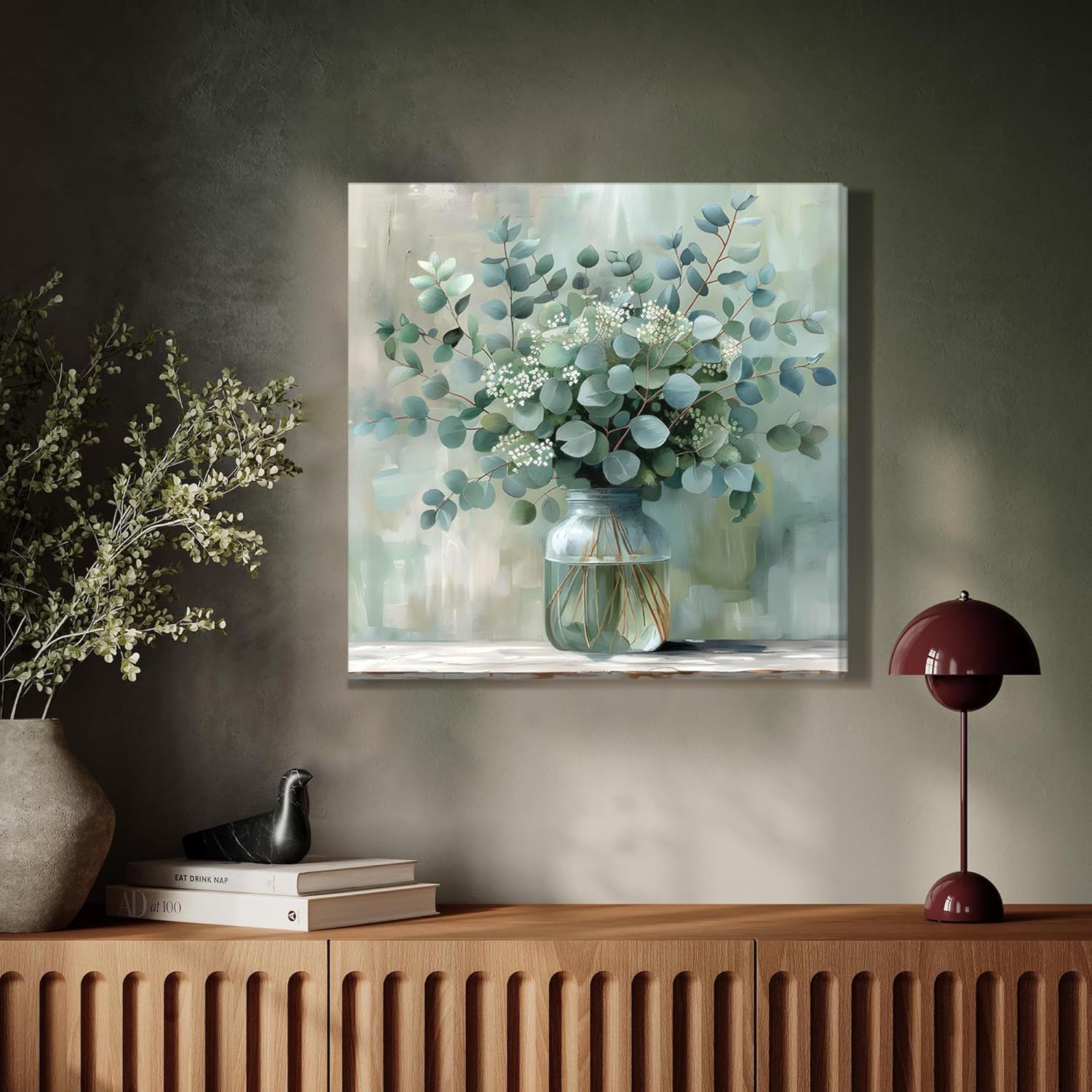 Serene Eucalyptus Bouquet Canvas Art: Invite tranquility into your home with this captivating canvas wall art featuring a lush arrangement of painterly eucalyptus leaves and delicate white accents in a glass jar; the soft sage green wall art palette and botanical theme create a refreshing indoor sanctuary, perfect for enhancing your space with calming plant prints and sophisticated modern farmhouse wall art style; adds a touch of minimalist wall art elegance