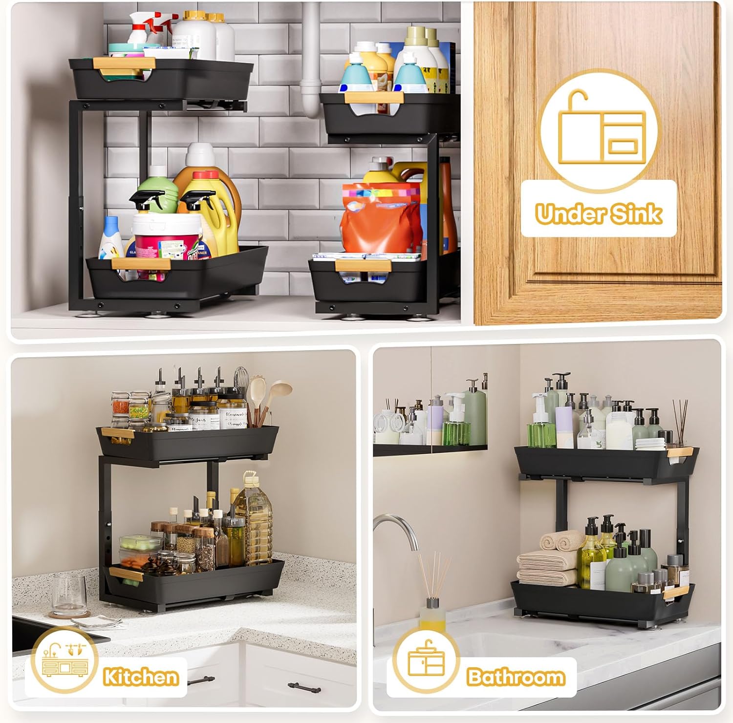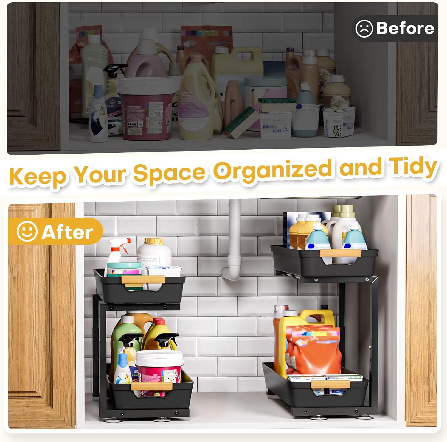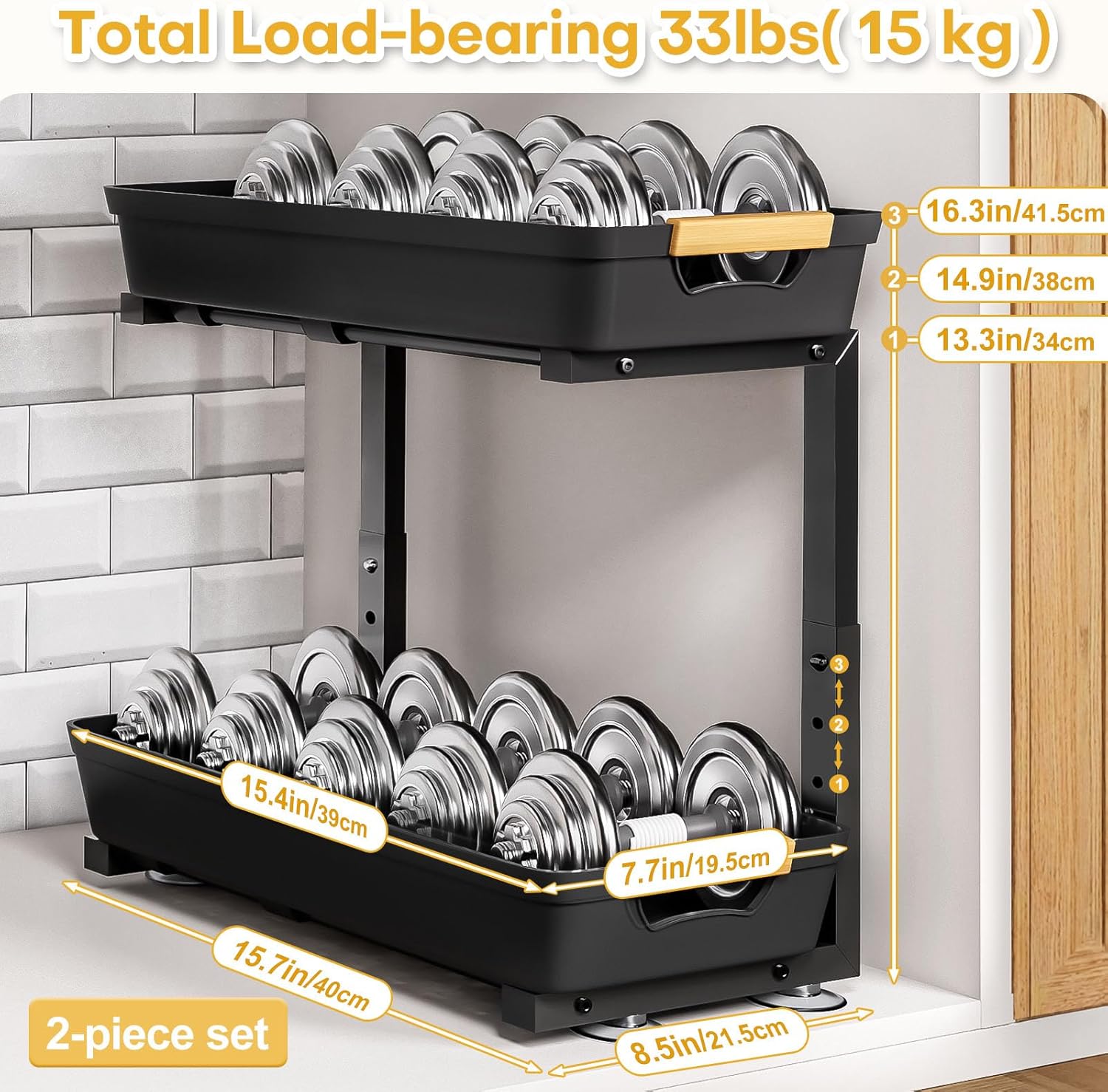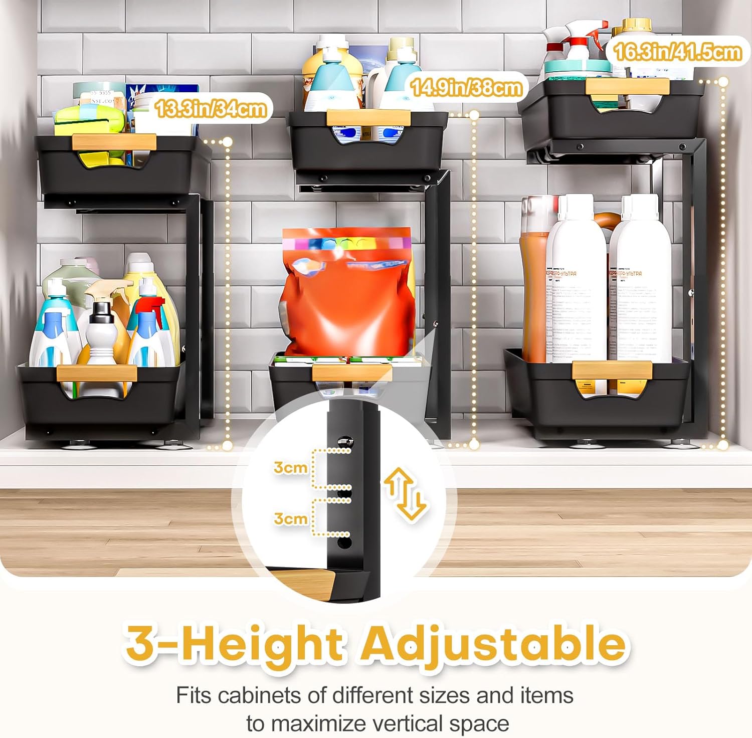 3 Adjustable Heights (13.4/14.9/16.3 Inch): Customize to fit tall bottles, cleaning supplies, or kitchen gadgets. Adaptable for under sink cabinets, bathroom vanities, or countertop spice racks – ideal for varying storage needs