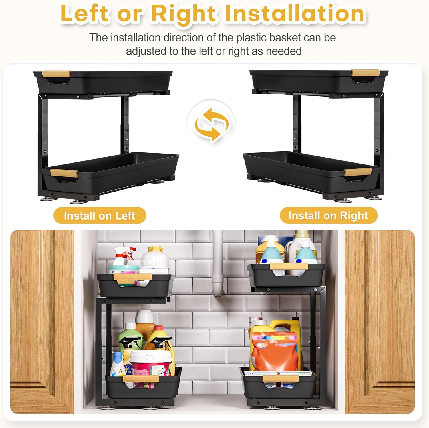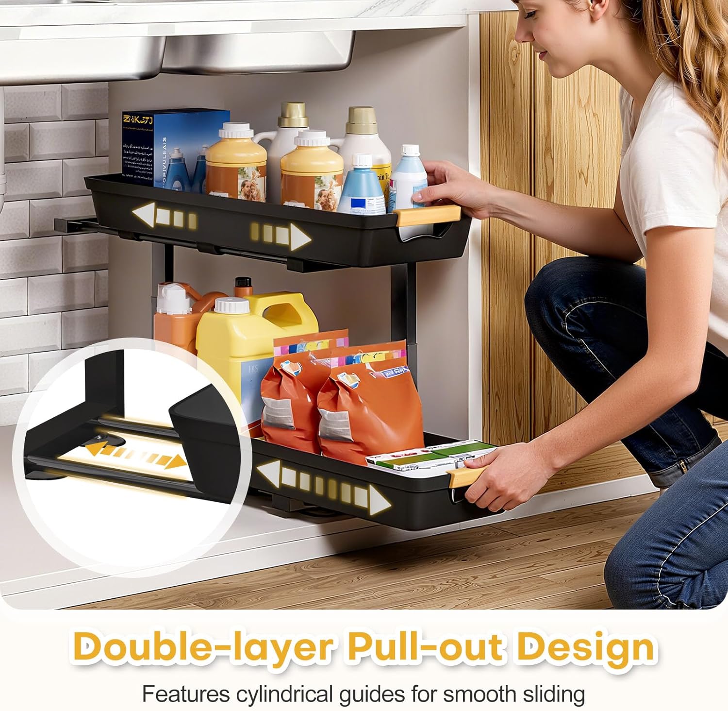 C-Shaped Pull Out Drawer Design: 2 tier sliding drawers with C-shaped frame for unobstructed access – no side barriers block hands, making storage/retrieval smooth. Great for narrow under sink cabinets, maximizing space in kitchen, bathroom, or pantry