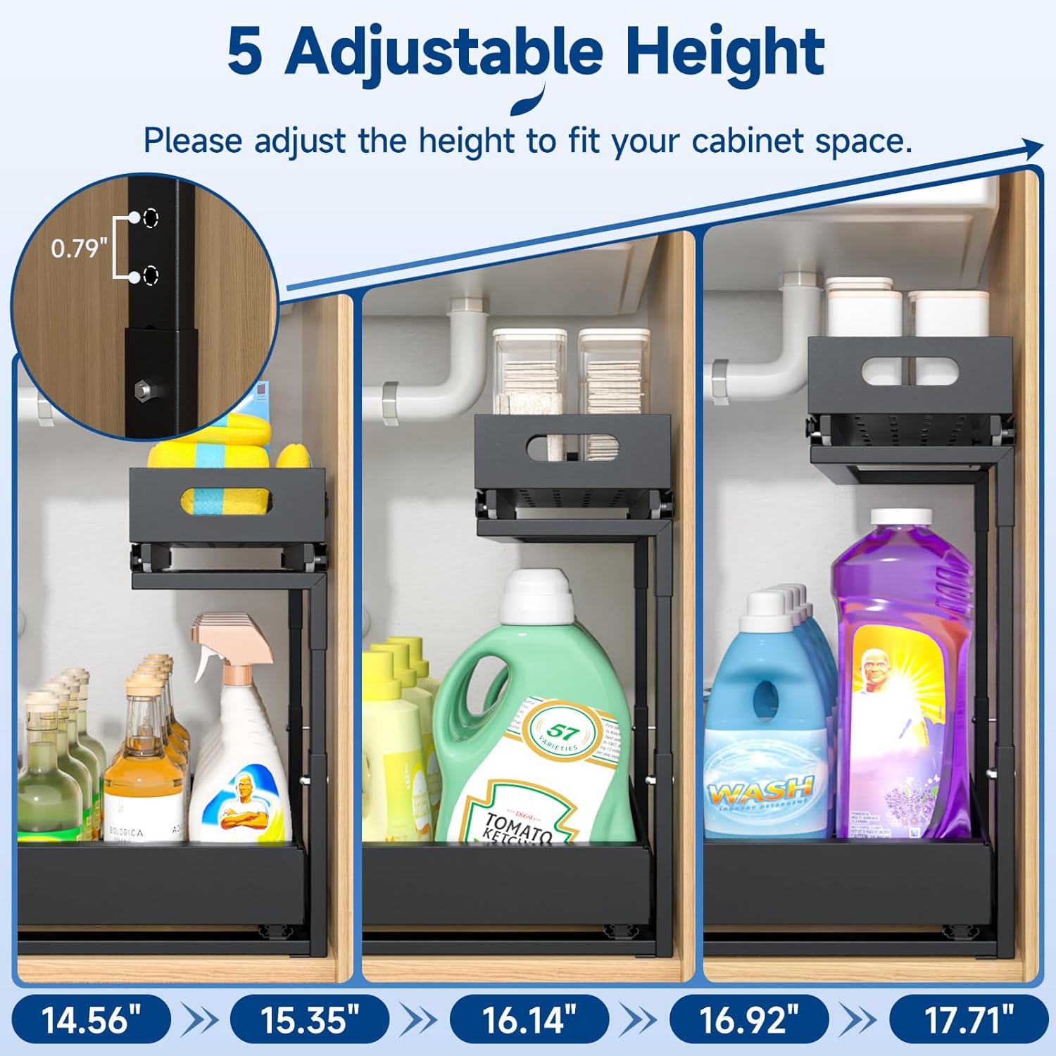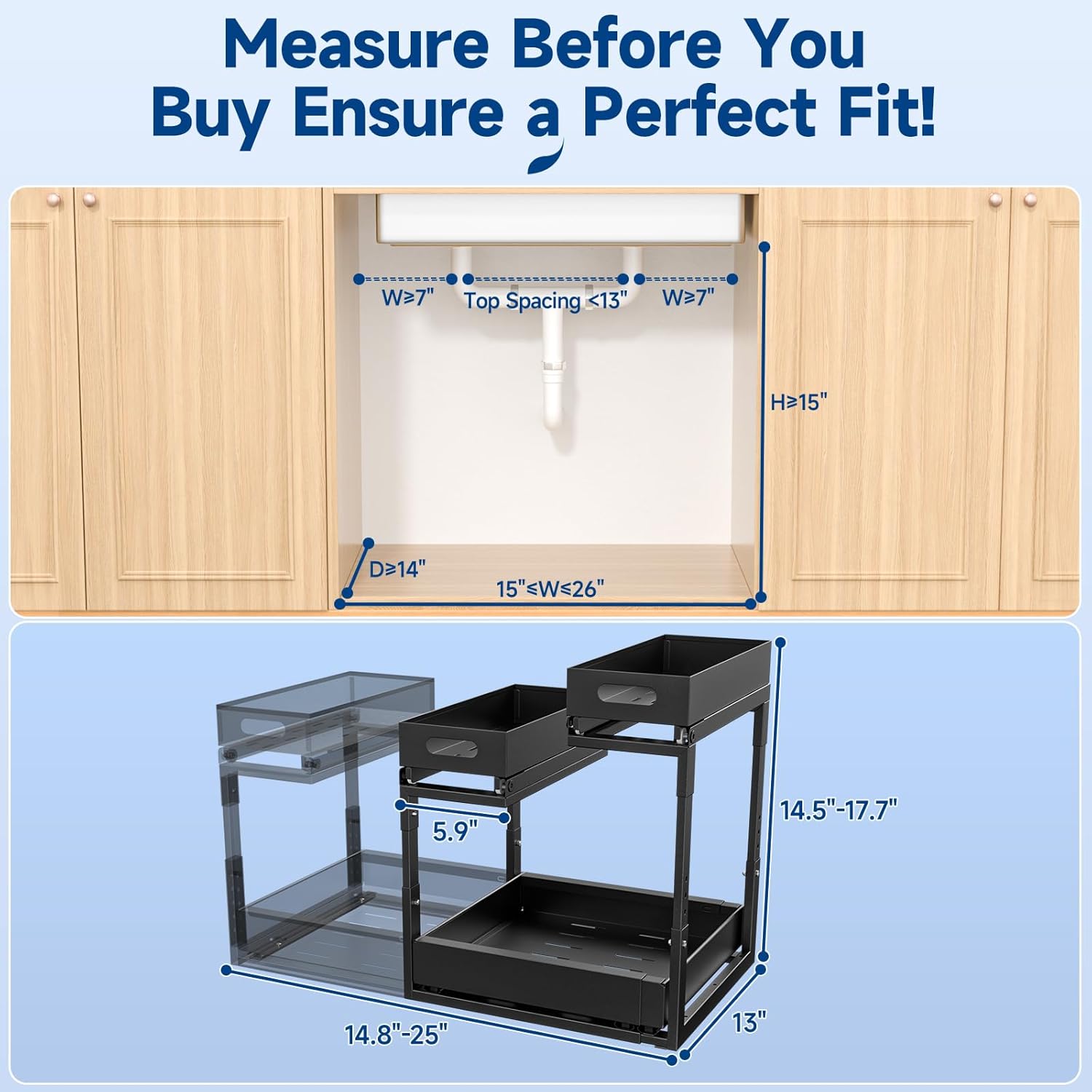 Adjustable width and height: This under sink shelf offers a custom fit for any space. The telescopic bottom drawer expands from 15″ to 25″ wide, complemented by 5 adjustable height levels (14.56″ to 17.71″), and the internal clearance between the side racks expands up to 13″. Perfect for organizing your kitchen, bathroom, laundry, restroom, vanity or pantry cabinets! Important Compatibility: Does not fit cabinets with center dividers or a bottom frame height over 0.5 inches.