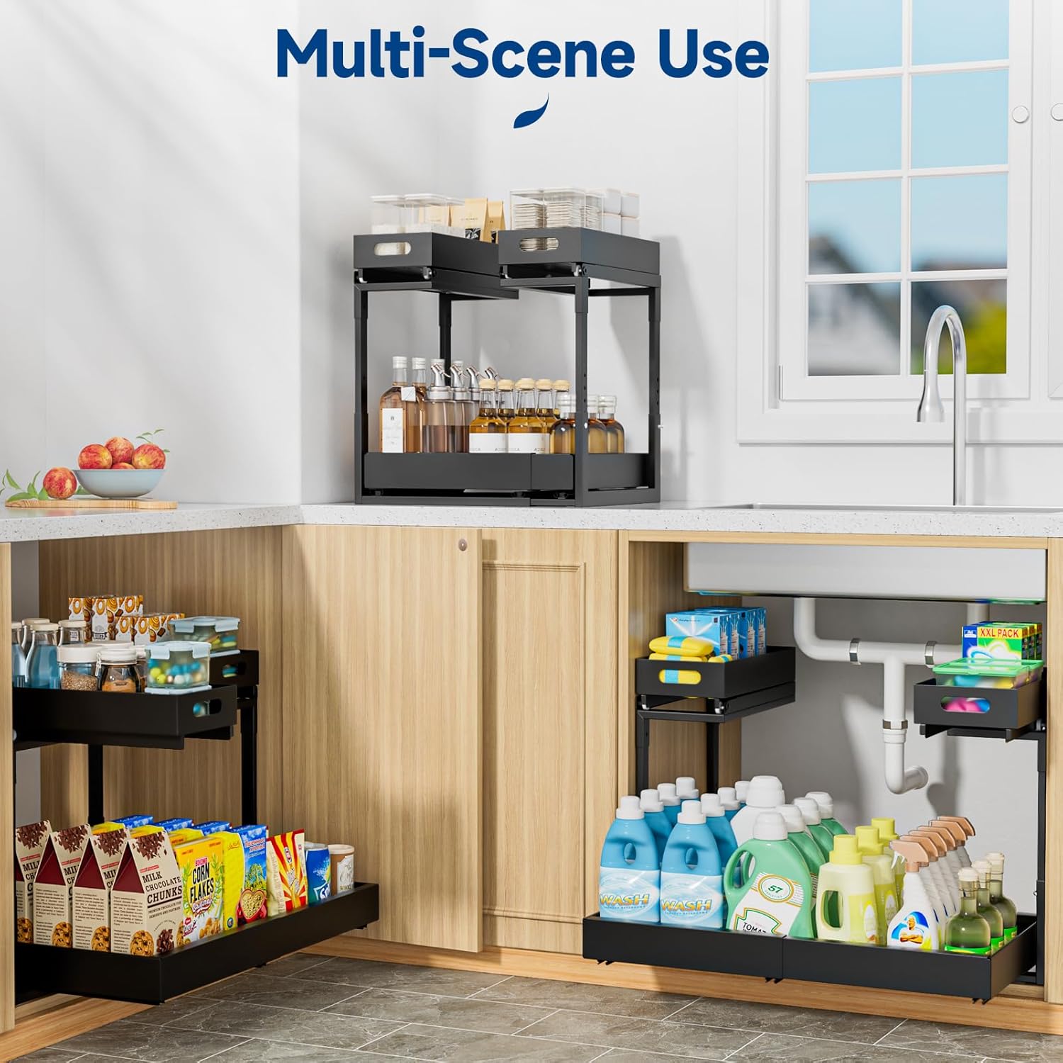 Upgraded 3-Rail: Kitchen under sink storage is upgraded with high quality smooth professional ball bearing slides and thickened rust-proof carbon steel for enhanced stability and 100 lbs weight capacity. The bottom basket is equipped with 3 sets of thickened and widened silent slides, the drawers run quietly and smoothly. Completely solve the traditional round tube slide friction jam, easy to fall off and other problems, longer service life.
