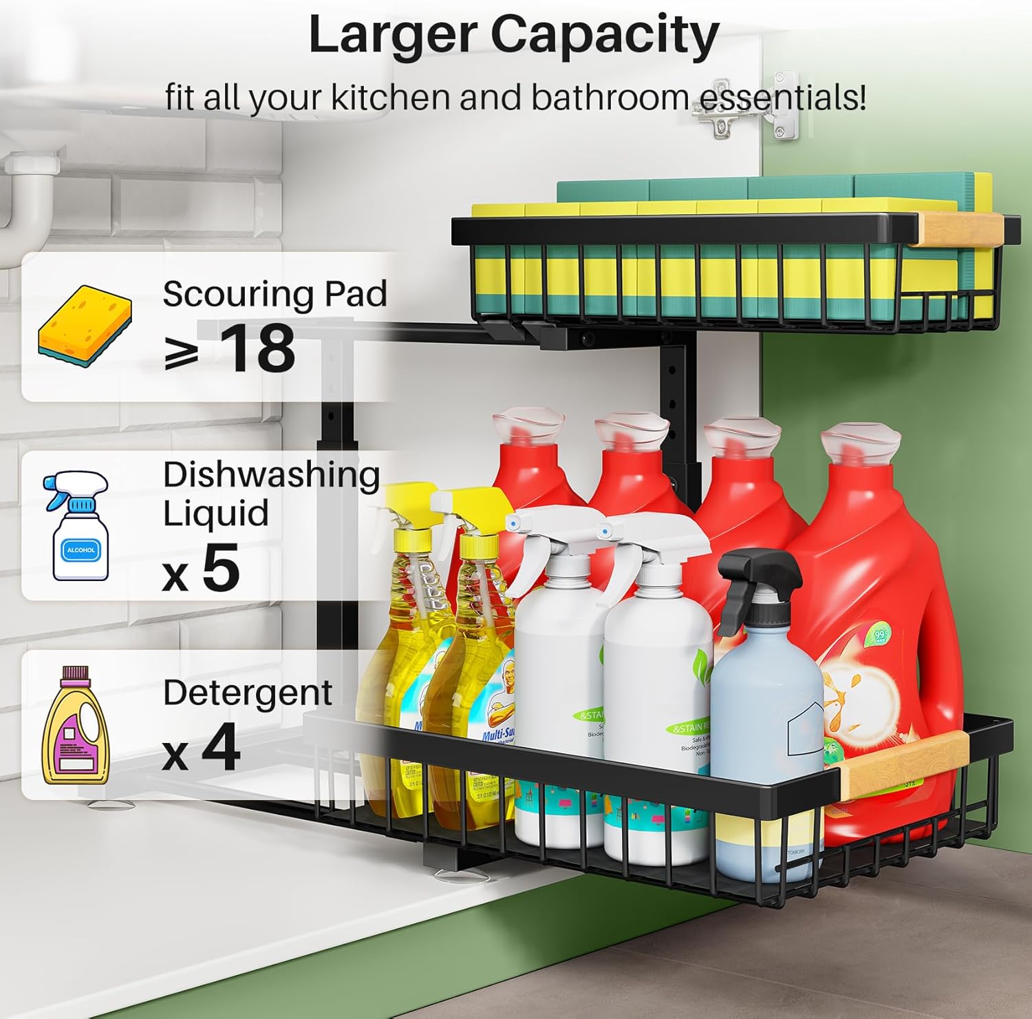 2-Tier Sliding Design for Easy Access: This pantry organizers and storage system features a smooth 2-tier sliding design, allowing you to easily reach items stored at the back without bending or kneeling. Perfect for organizing cleaning supplies or toiletries, it’s also a great solution for bathroom organizers and storage, ensuring everything is within reach.