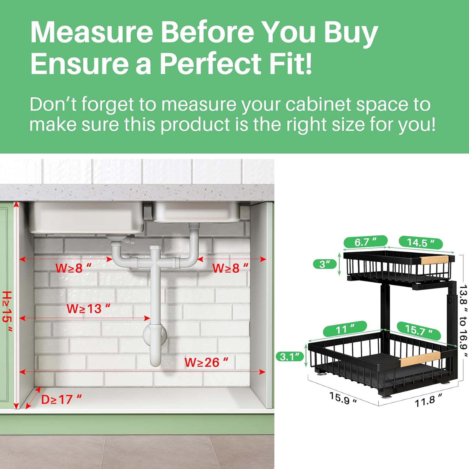 Larger Organizer for Maximum Efficiency: This under sink organizer, measuring 11.8″W x 15.9″D x (13.8″-16.9″)H, providing more capacity for storing taller bottles, cleaning supplies and other essentials.Before purchasing, please double-check your cabinet dimensions to ensure this under cabinet organizer fits properly.