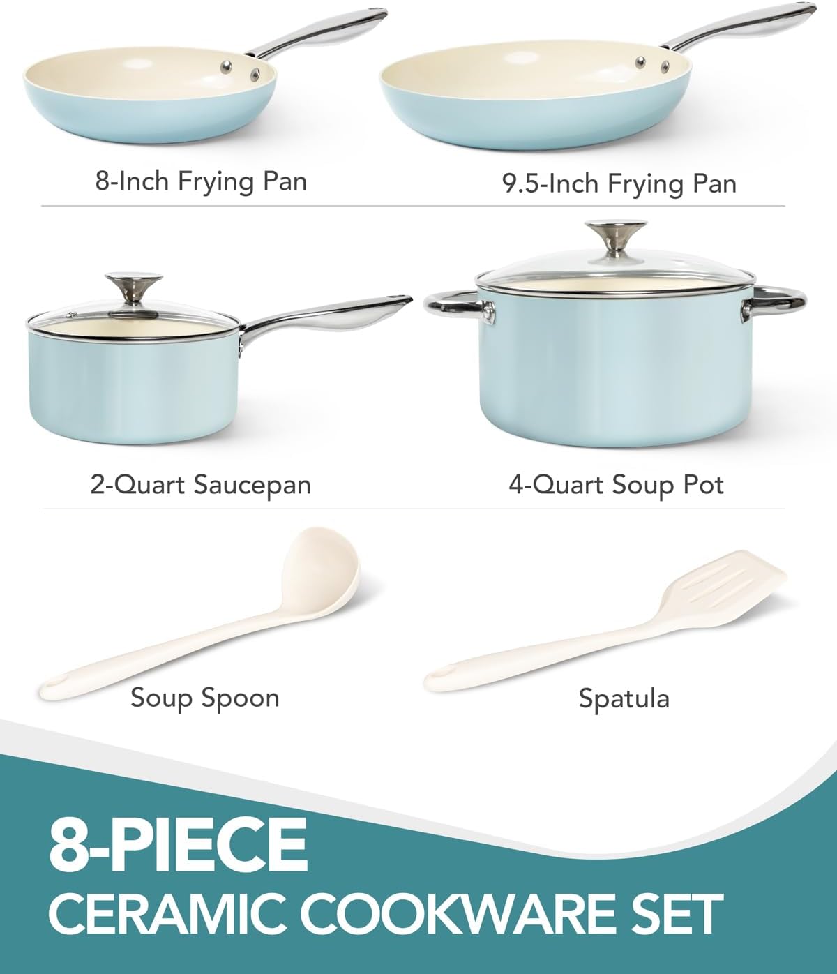 MICHELANGELO Pots and Pans Set Non Stick – Titanium Cookware Set Non Toxic Ceramic Coating, 8-Pcs Nonstick Pots and Pans with Ergonomic Handle, Dishwasher Safe & Induction Compatible, Blue