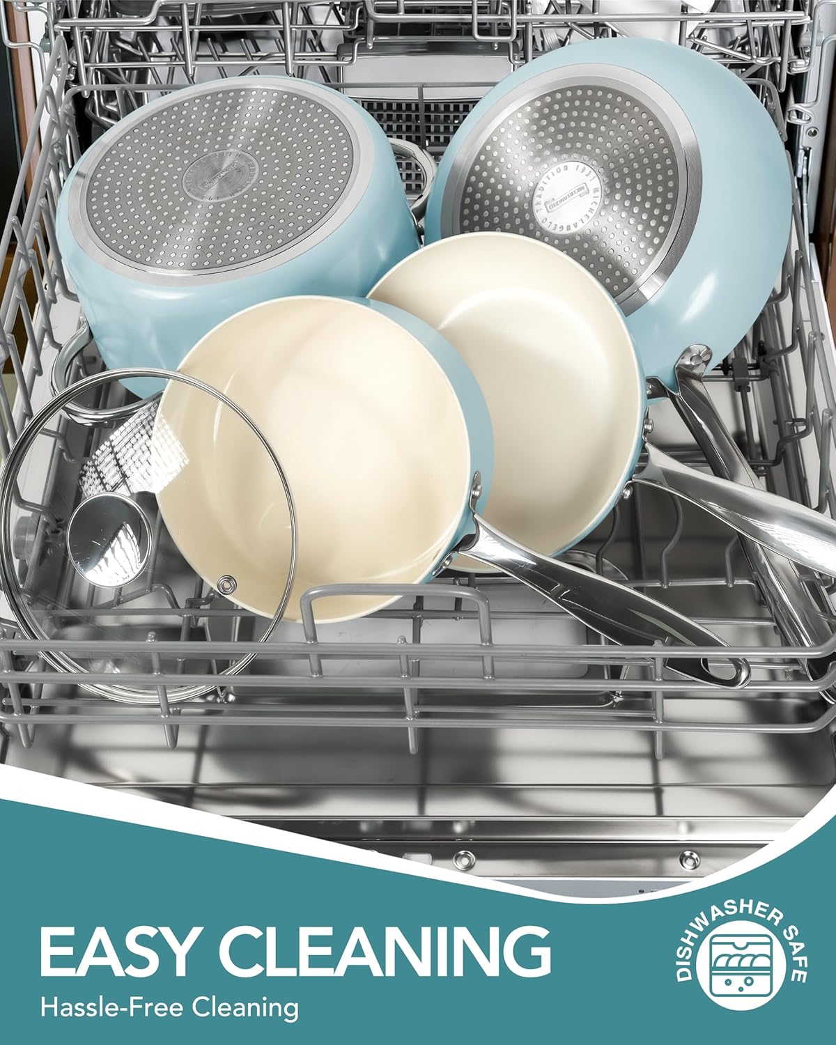 Naturally Non-Stick & Healthy Cooking – Experience effortless cooking with our ultra nonstick pots and pans set. Designed as a healthy ceramic cookware set, it requires minimal oil, cleans easily, and supports your non toxic lifestyle. Perfect for everyday meals!