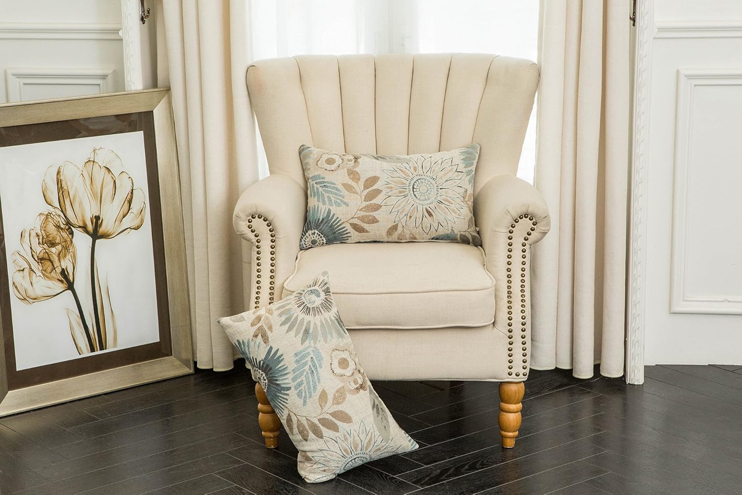 Mika Home Pack of 2 Decorative Oblong Rectangular Throw Pillow Cover Cushion Cases for Chair,Sunflower Pattern,12×20 Inches, Blue Cream