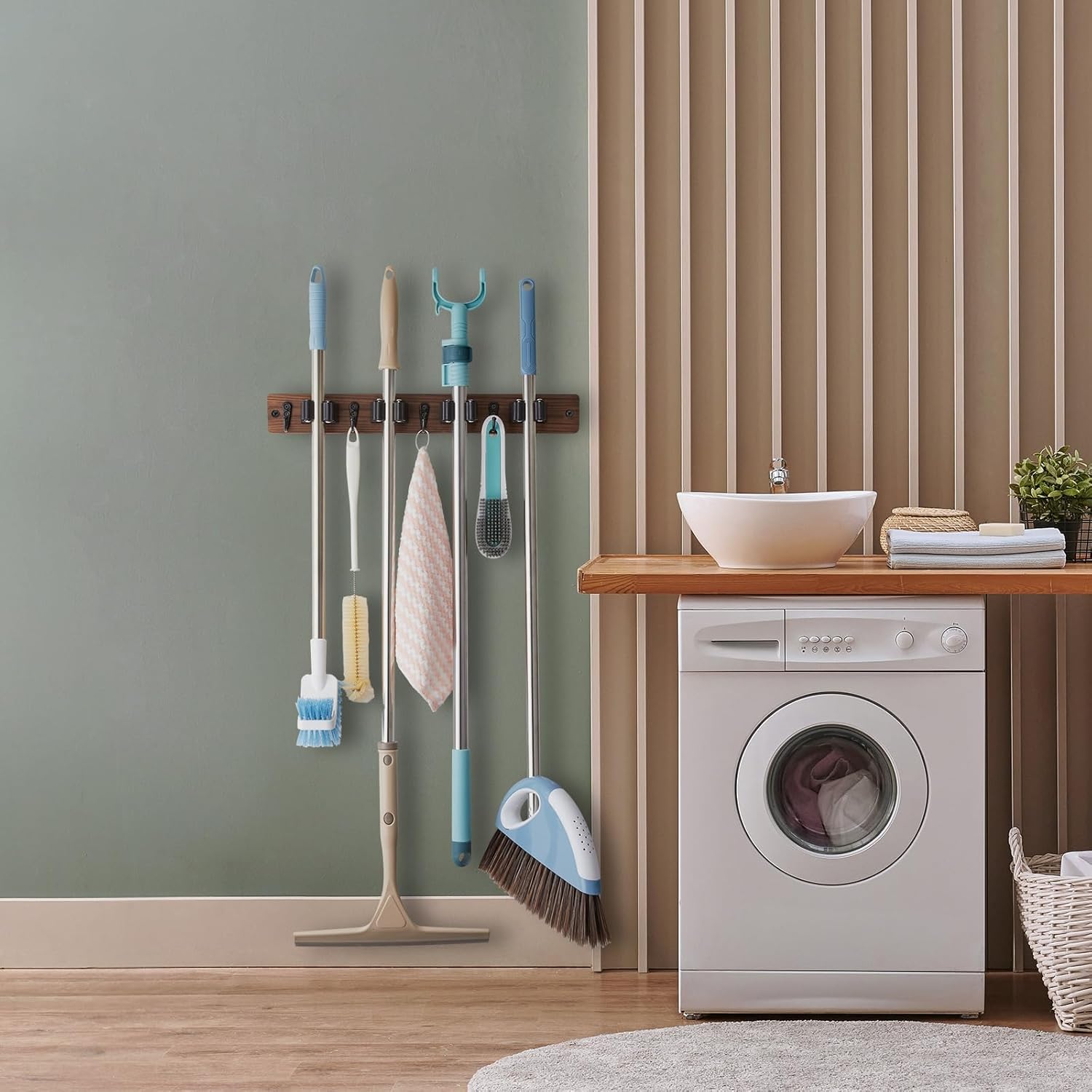 ORGANIZE AND SAVE SPACE – The wall mounted mop and broom holder provides you easy access to store and grab brooms, dustpans, and mops, while also freeing up closet space. Keep your cleaning tools organized and within reach.