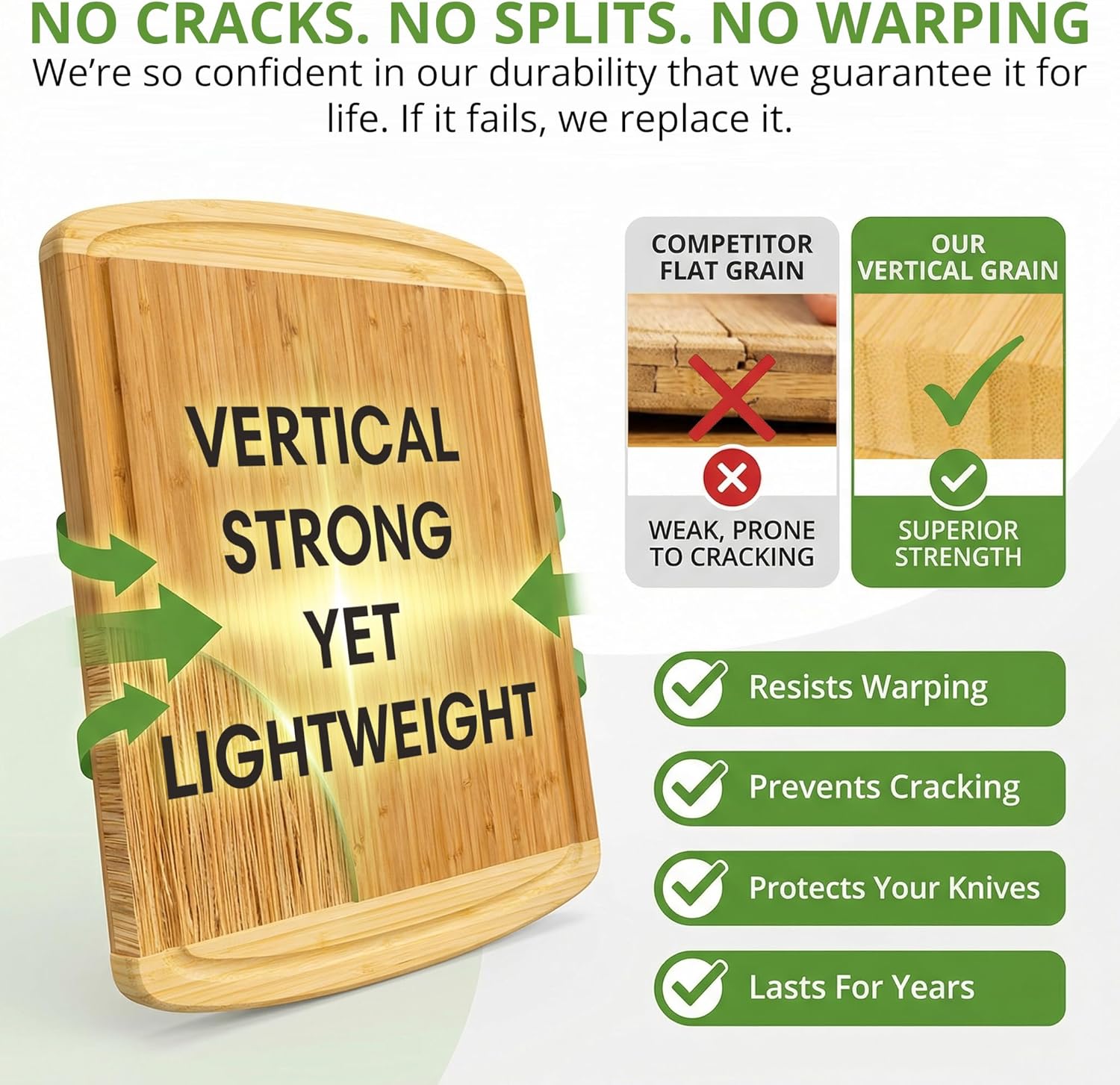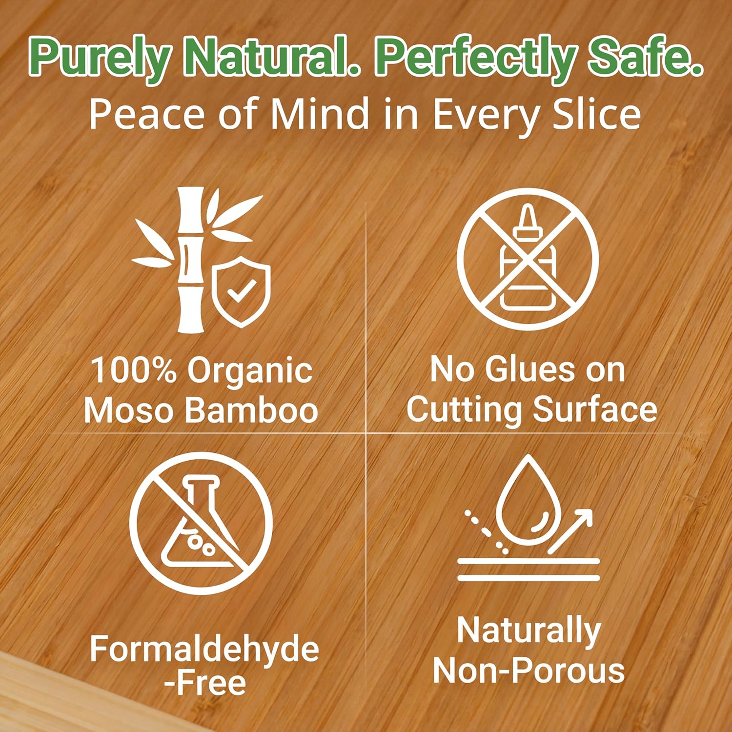 SAVES YOUR EXPENSIVE KNIVES: Unlike dense wooden cutting boards for kitchen use (like Acacia or Teak) which are extremely hard and dull blades quickly, our Moso Bamboo is naturally “yielding.” It creates a durable wood cutting board set that provides a solid surface for chopping but is gentle enough to keep your chef’s knives razor-sharp for longer.