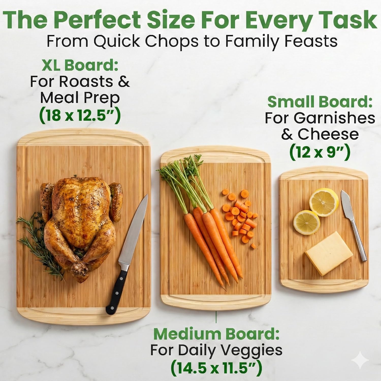 50% MORE SURFACE AREA (XL VALUE SET): Stop struggling with cramped, tiny boards. Our bamboo cutting board set gives you an extra large cutting board 18×12.5″” surface for holiday turkeys and meal prep, plus medium (14.5×11.5″ and small (12×9″) boards for quick tasks—offering significantly more workspace than a standard chopping board set for the same price.