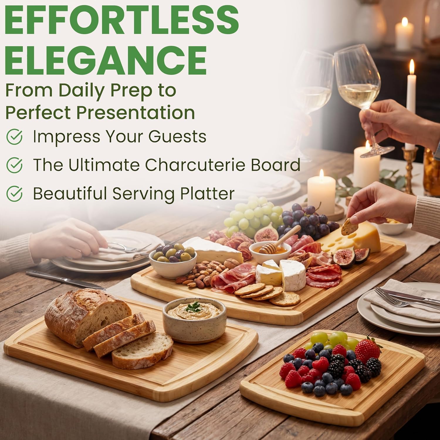 FROM PREP TO PARTY (DUAL-SIDED): Designed for real life, these are better than basic bamboo cutting boards for kitchen prep. Side A features deep “No-Mess” juice grooves to catch runoff from roasts and watermelons. Side B is completely smooth, transforming instantly into an elegant serving tray for charcuterie, cheese spreads, and appetizers.