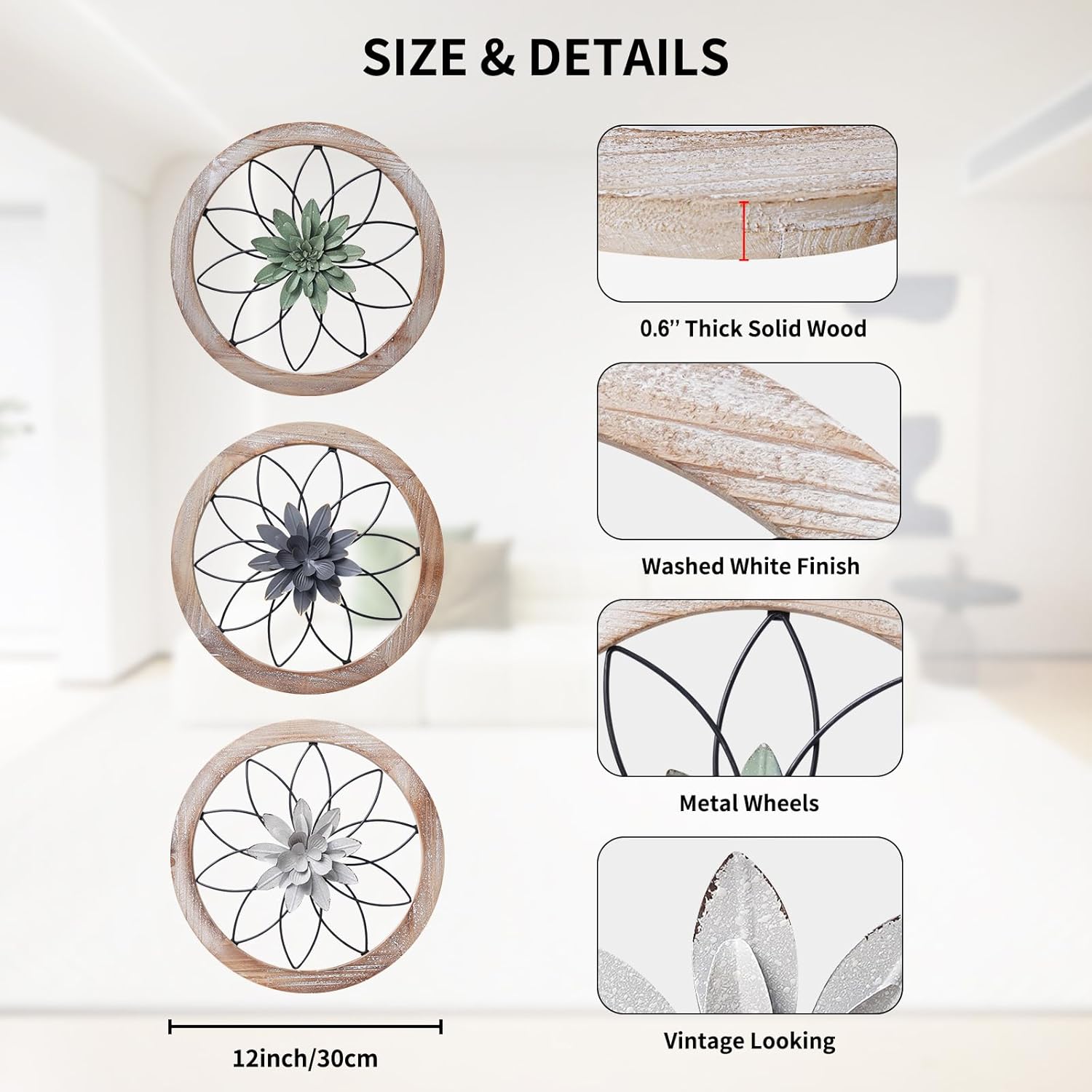 FARMHOUSE WALL DECOR — These 3 pcs round kitchen wall decor made of fir wood frame and metal wheels, come with 6 replaceable metal flowers, the rustic style is perfect for both modern or farmhouse home decor