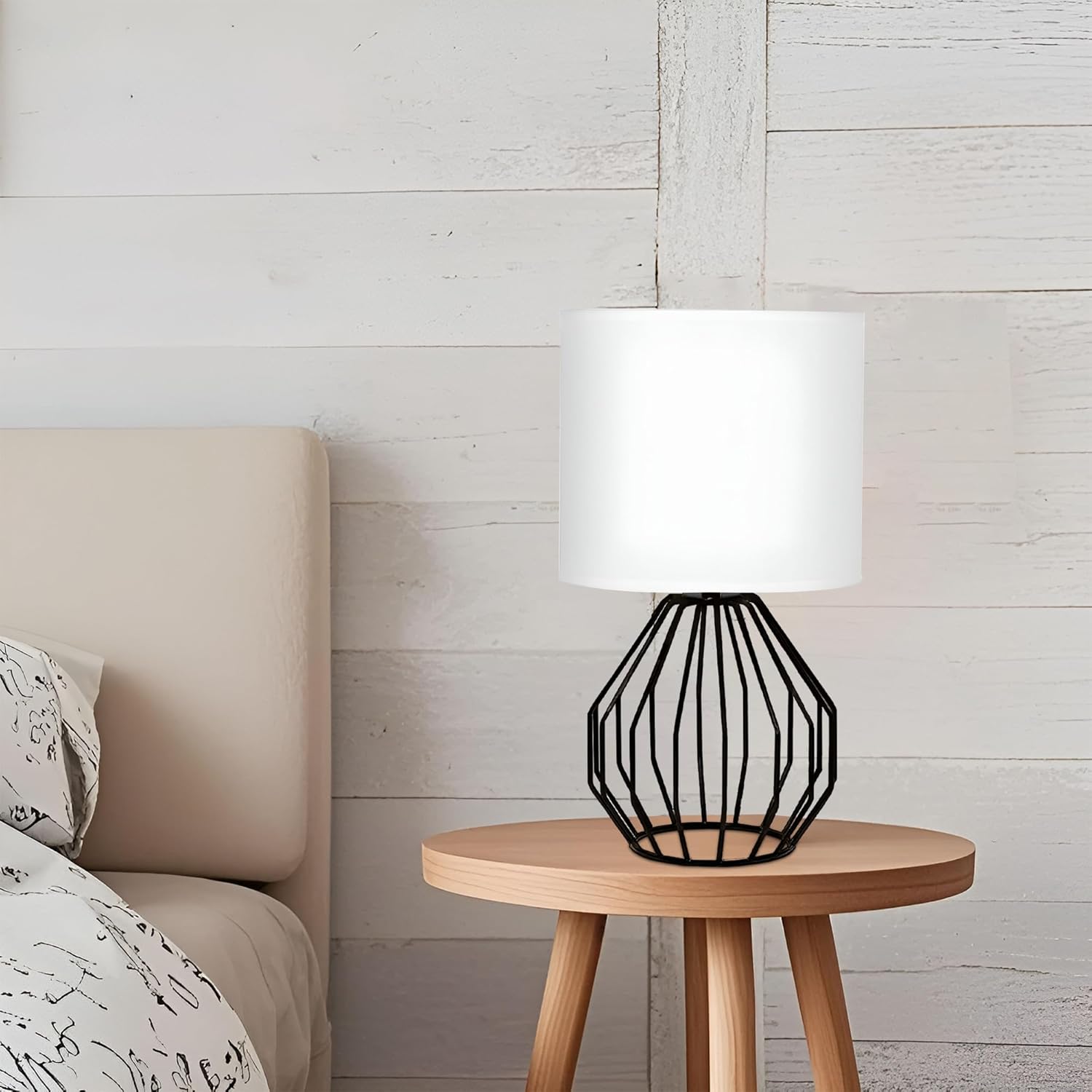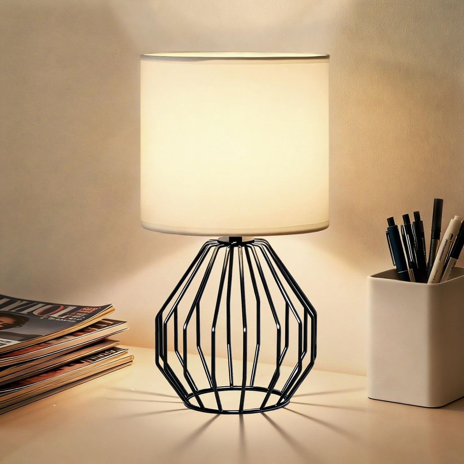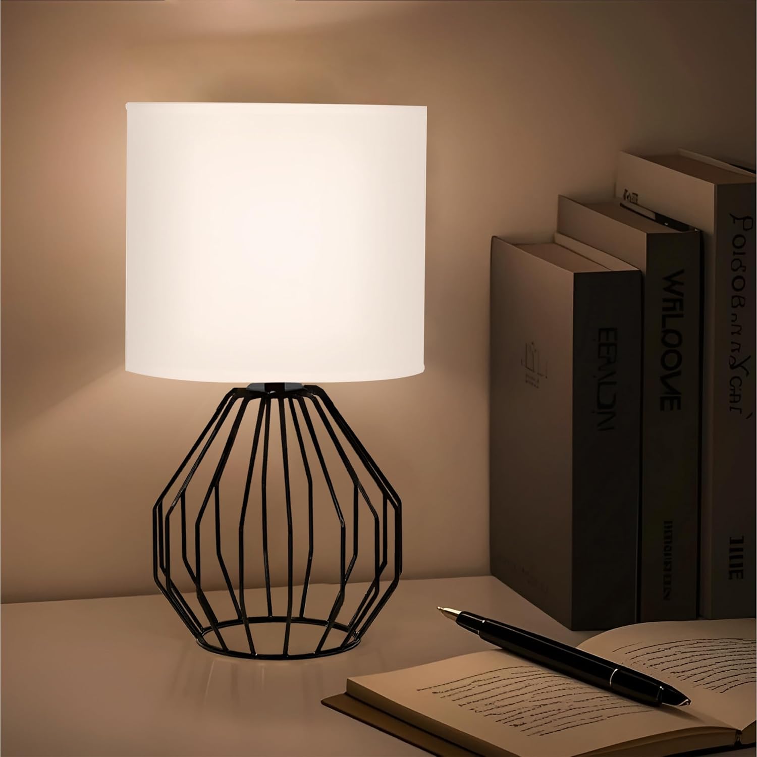 Small Table Lamp Black, Modern Minimalist Desk Lamp with Metal Base White Fabric Shade, Bedside Nightsand Table Lamp for Bedroom, Living Room, Kis Room