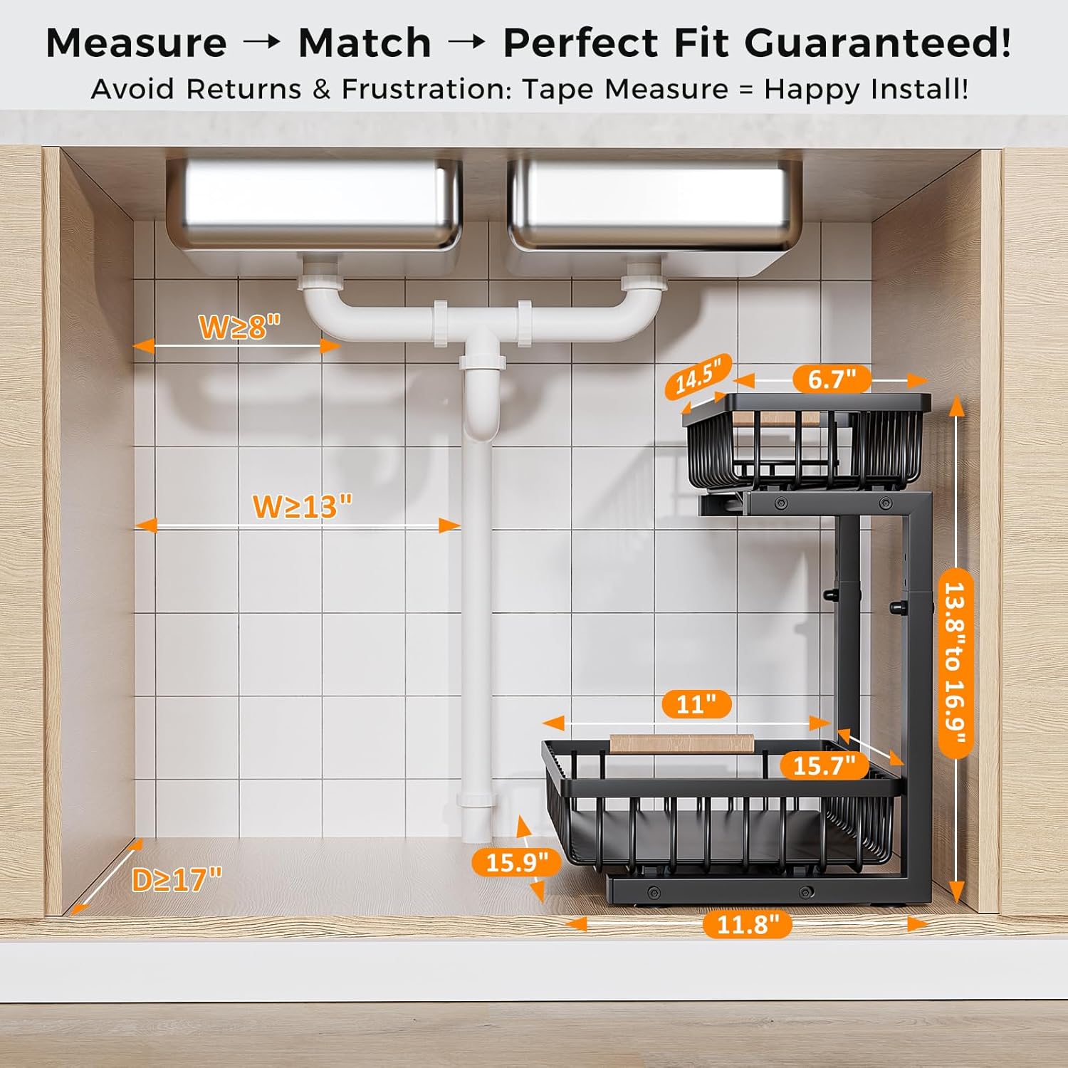 🔄 Spacious & Adjustable Under Sink Organizer: Maximize cabinet efficiency with our extra-large design (11.8″W x 15.9″D x 13.8″-16.9″H). Effortlessly store tall bottles, cleaning supplies, and bulky essentials while the height-adjustable feature adapts to your space. Tip: Measure your cabinet depth/height before ordering for a perfect fit!