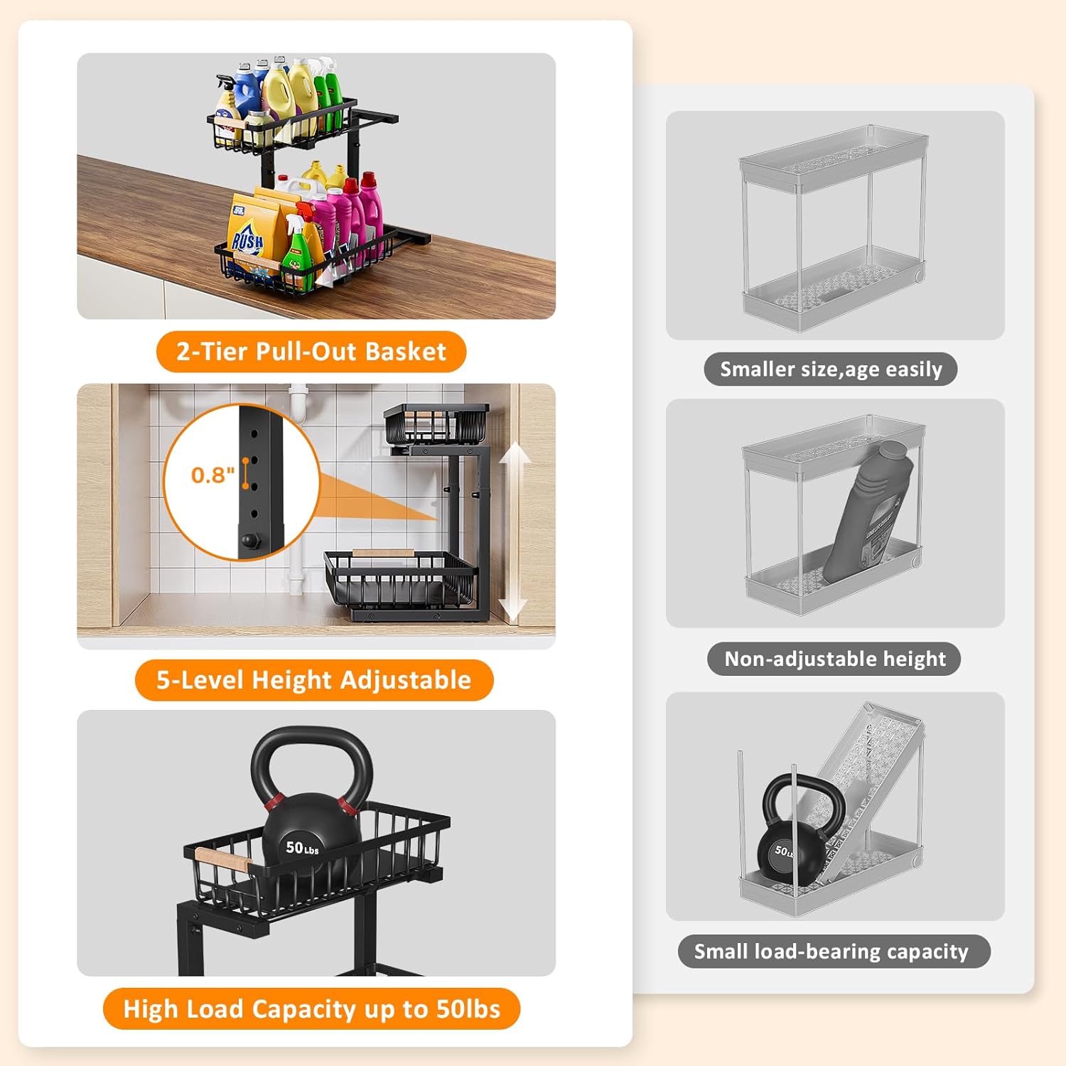 🏆 Industrial-Grade Stability: Engineered with thicker, heavier steel + 1″ reinforced frame, this premium under kitchen sink organizer delivers wobble-free durability for heavy loads. The weighted base design creates rock-solid stability, making it the ultimate long-term under cabinet organizer for bulky detergents