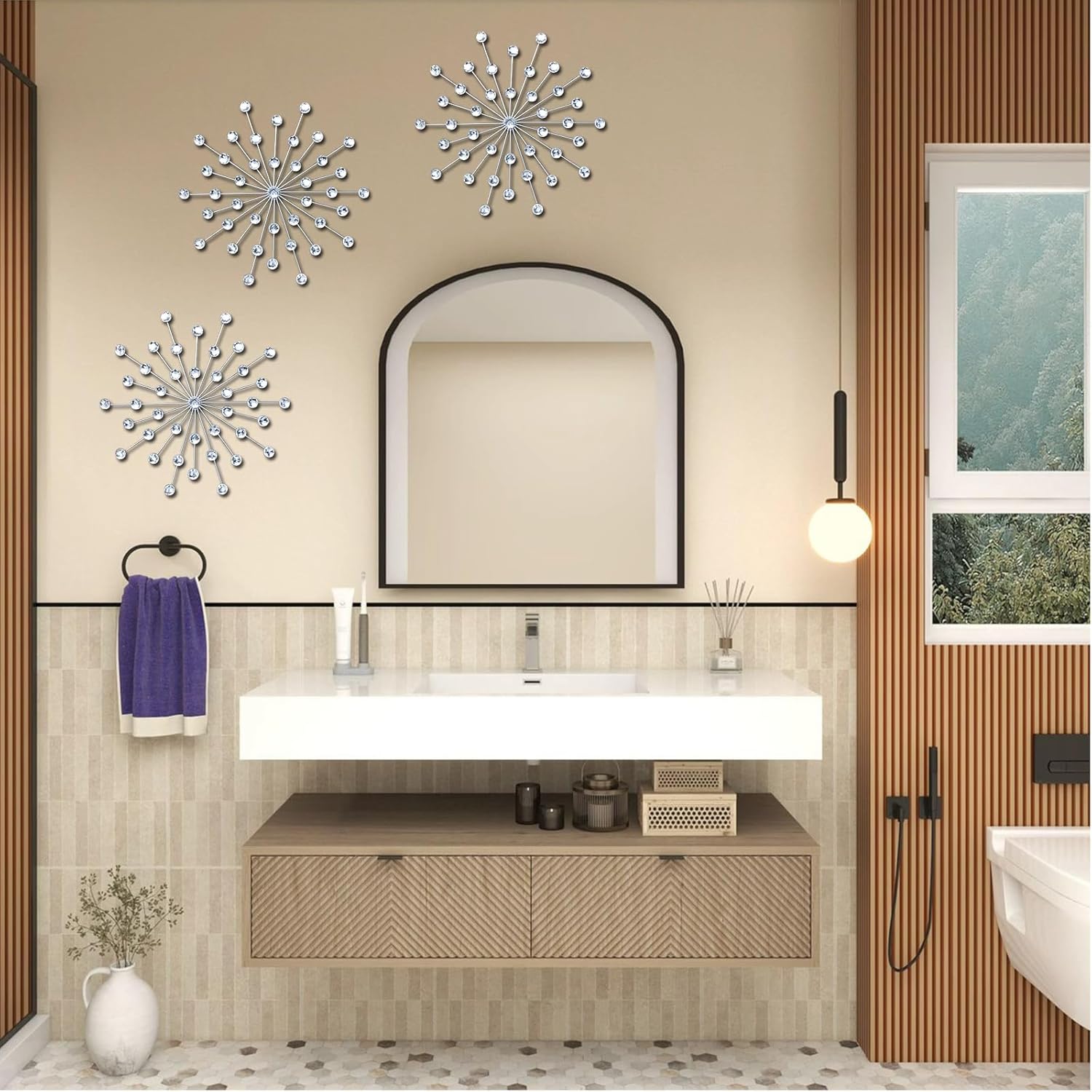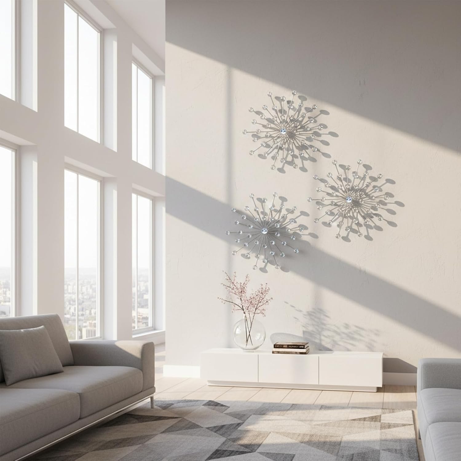 【 GLAM SILVER SUNBURST WALL DECOR SET 】 – 3 piece silver metal starburst wall art with sparkling crystal rhinestones creates a stunning focal point on any living room, bedroom or hallway wall.